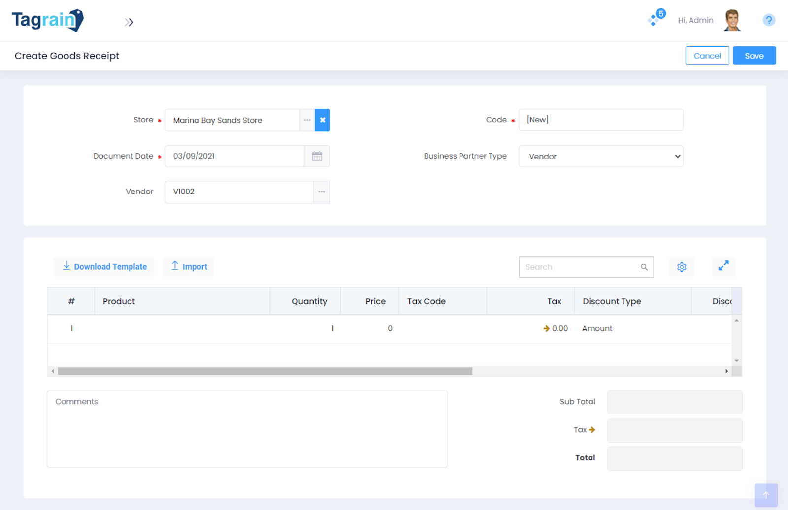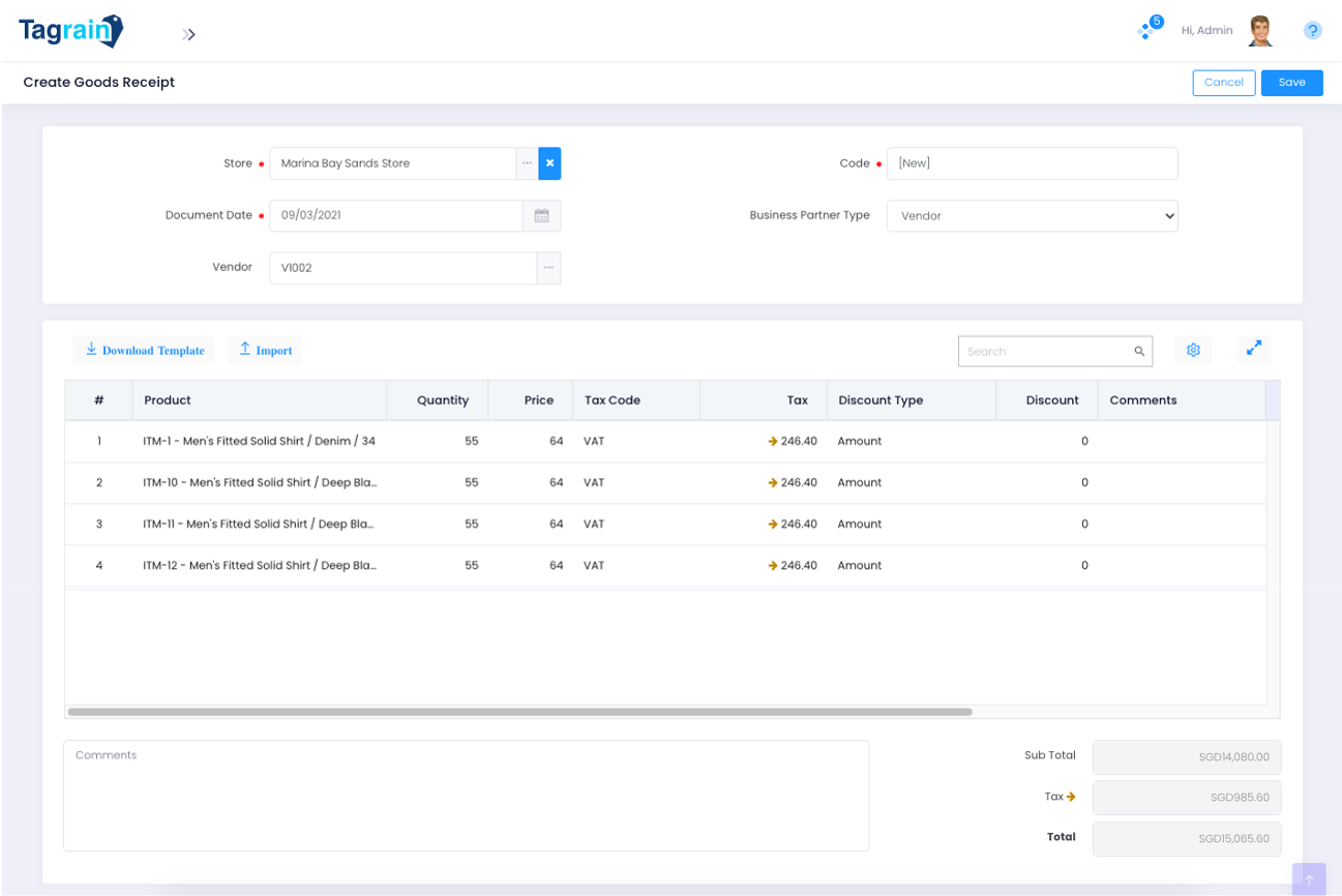 Managing Inventory Transactions in Tagrain is quick and simple. Tagrain allows users to upload Goods Receipt data using Excel based import template.