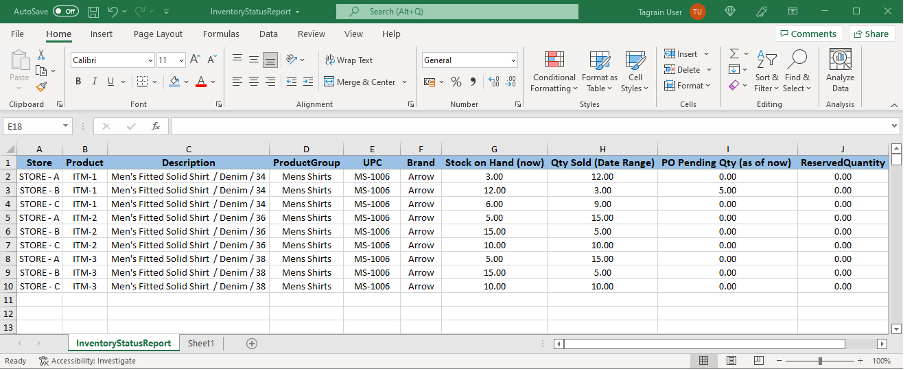 Tagrain allows you to export your inventory status report via the export template. This template is excel based and allows you to review the inventory status across all your stores in one single sheet. This feature proves useful to managers and administrators who are held responsible and accountable for application management. Once you have generated the Inventory Status Report as per the steps explained above, you need to click on the Export button. Clicking the Export symbol will download the InventoryStatusReport.xls file to your Downloads folder. However, if you want to save the file to a different location on the drive, you may click the Save As button and then navigate to your desired location on the drive and then click the Save button.