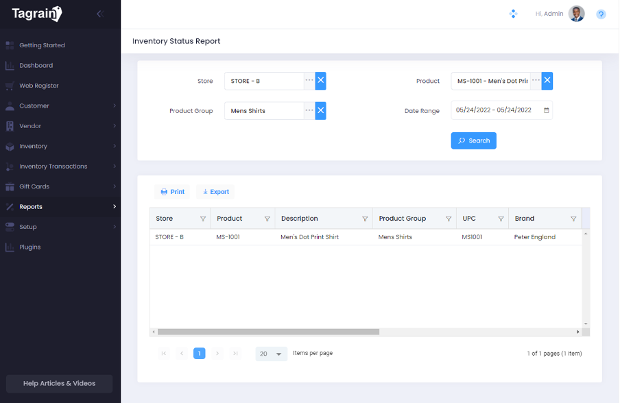 Tagrain allows you to print the Inventory Status Report. You can follow the steps below to print the Inventory Status Report.