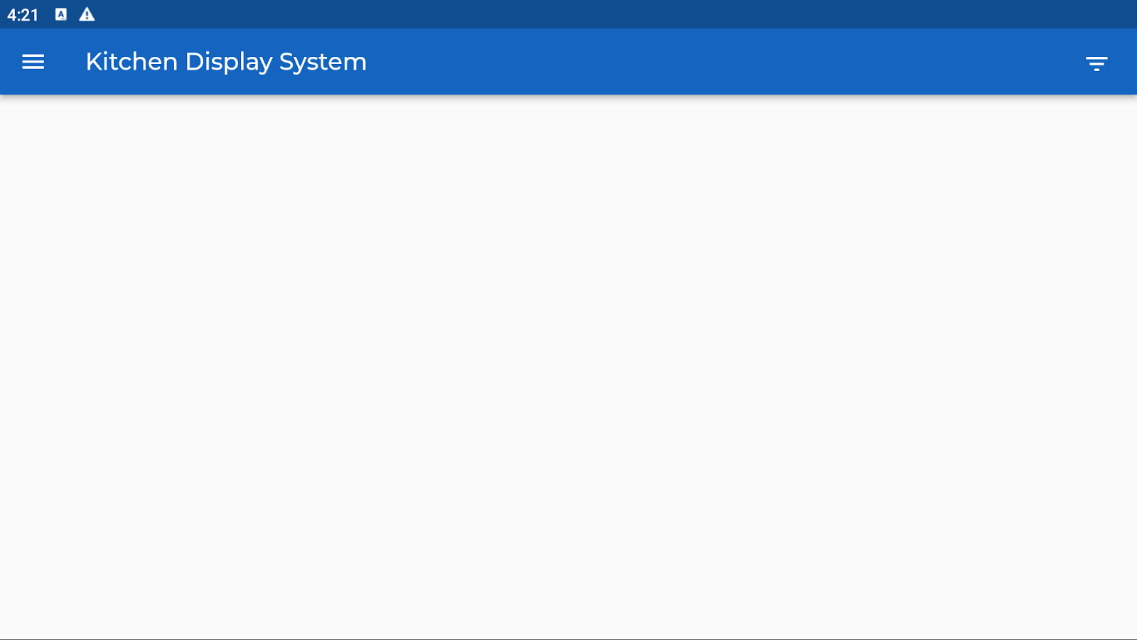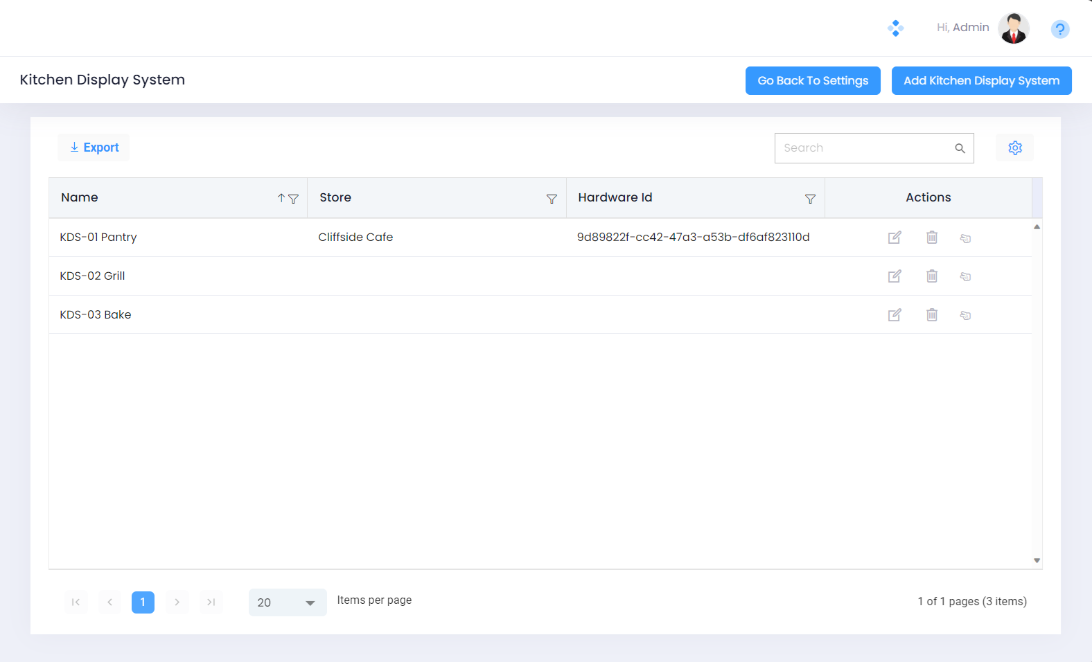 The Kitchen Display System List View screen will display a list of KDS installed at each section of the kitchen. For example, a kitchen may have different sections: grill, bake, pantry, etc.