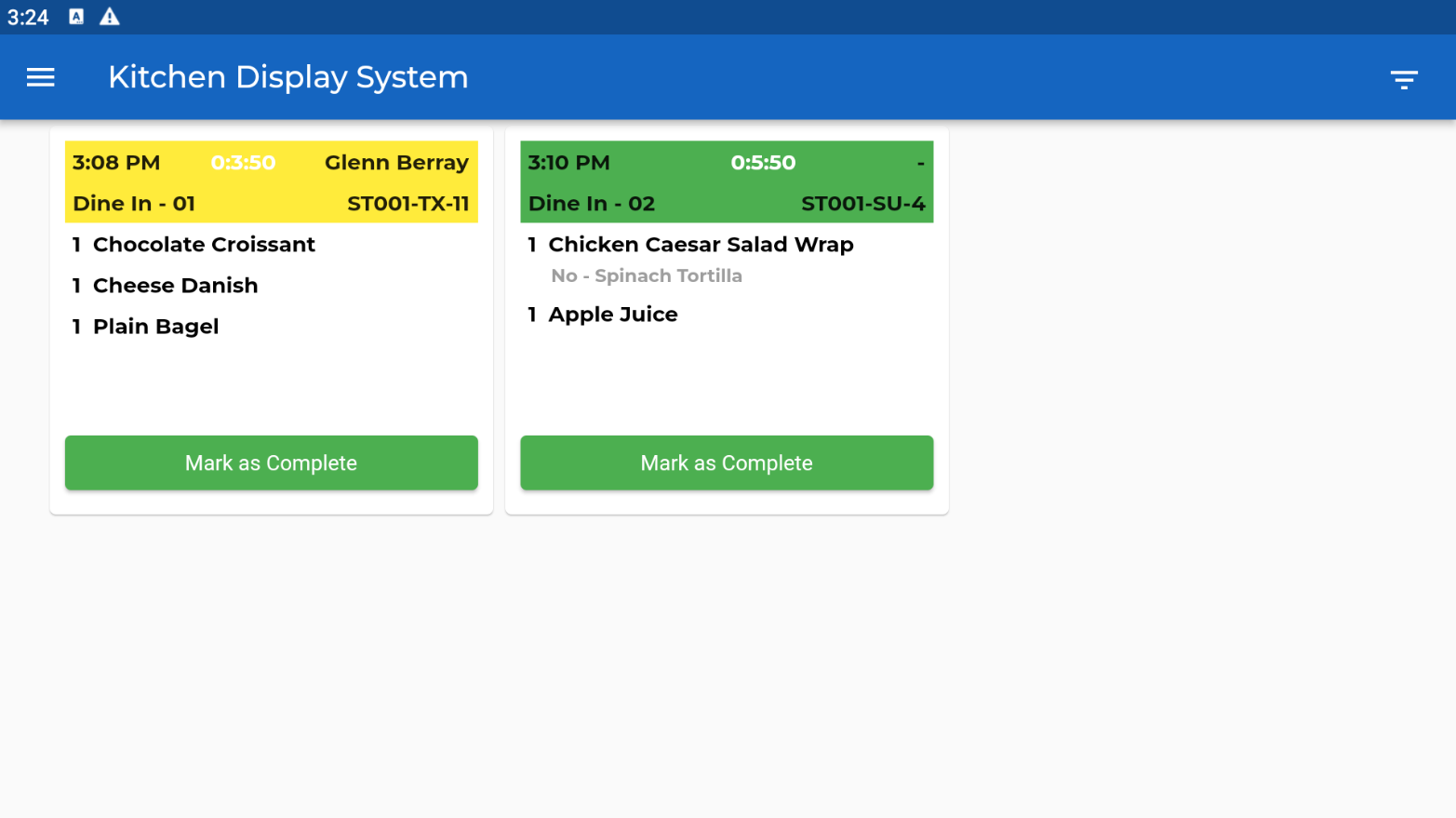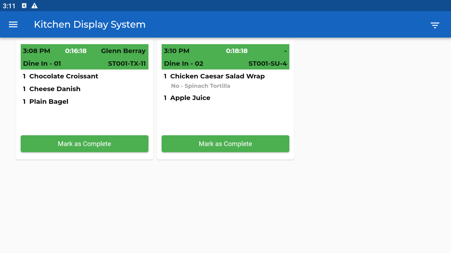 The same orders when viewed on the Kitchen Display System look like what is shown in the image below: