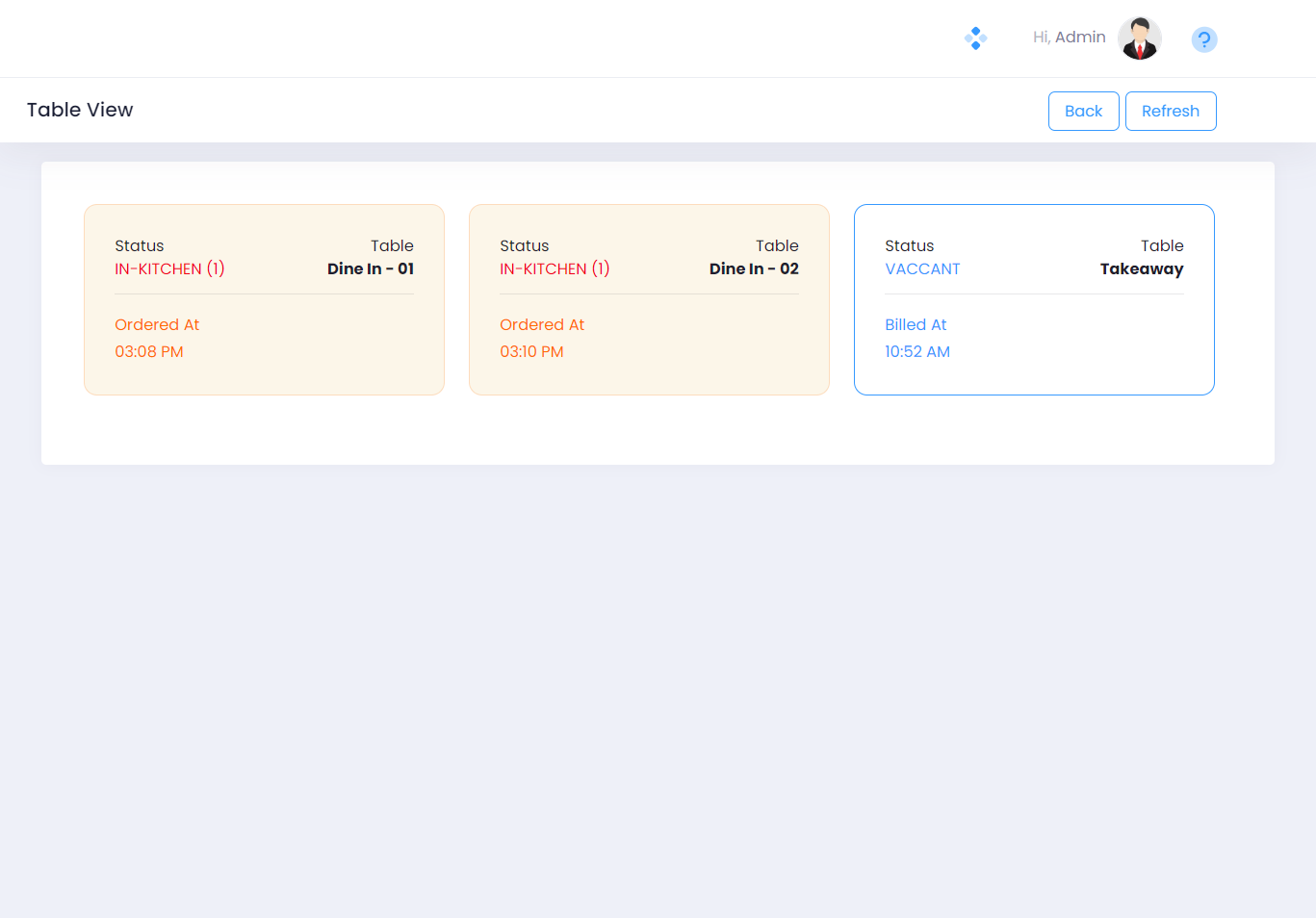 Irrespective of what type of table order you place, if you switch to the Table View, you will see the status for both these orders is marked as In Kitchen. This is because the order is confirmed and the food is being prepared in the kitchen.