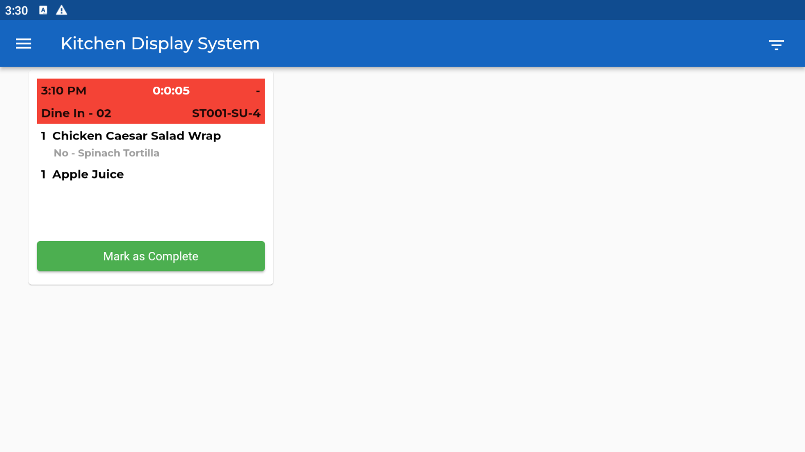 Tap on the Mark as Complete button to complete the order. When you mark the order as complete, the Dine In -01 tile disappears from the Kitchen Display System.