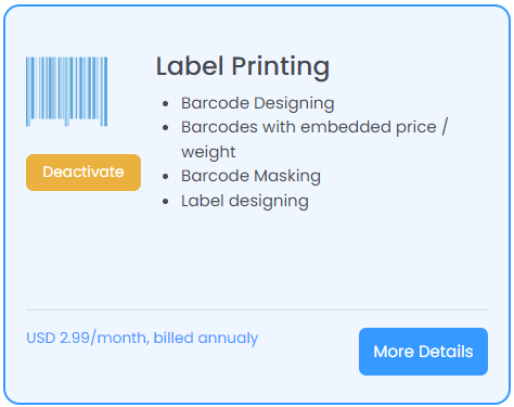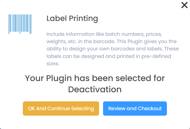 Step 3. Navigate to the Already Active section on the Purchase Subscription page. Untick / deselect the Label Printing plugin to mark the plugin as Inactive.