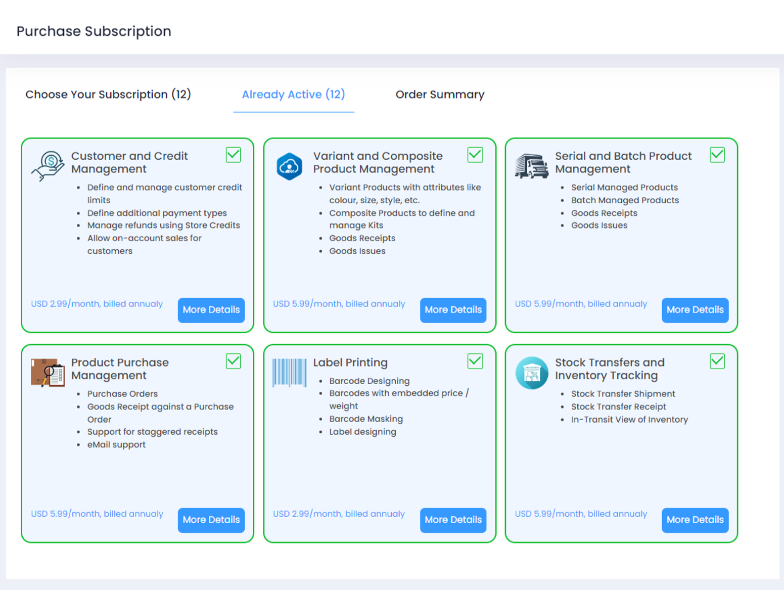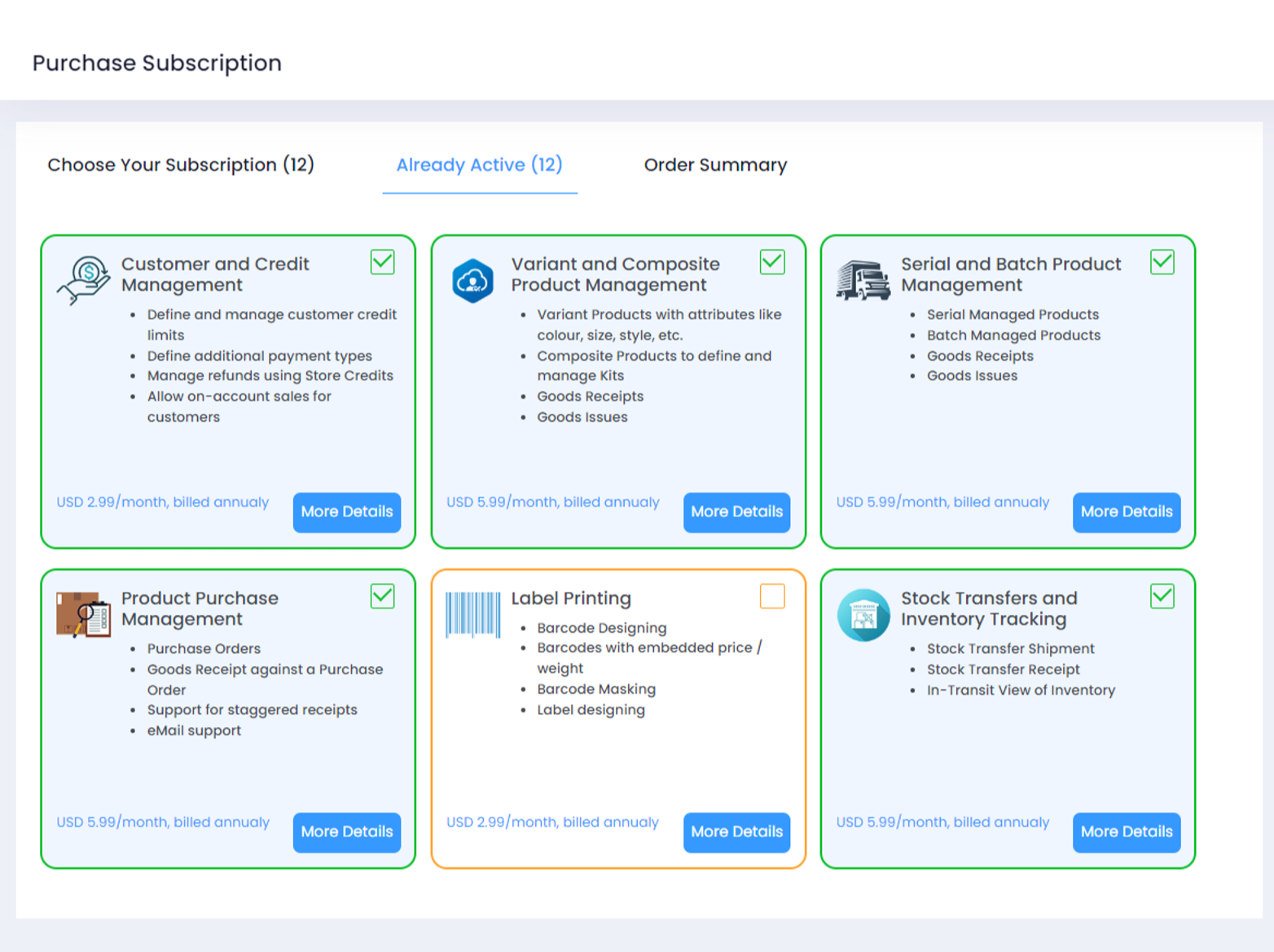 Step 4. Navigate to the Already Active section on the Purchase Subscription page. You should see the Label Printing plugin unticked / deselected for deactivation.