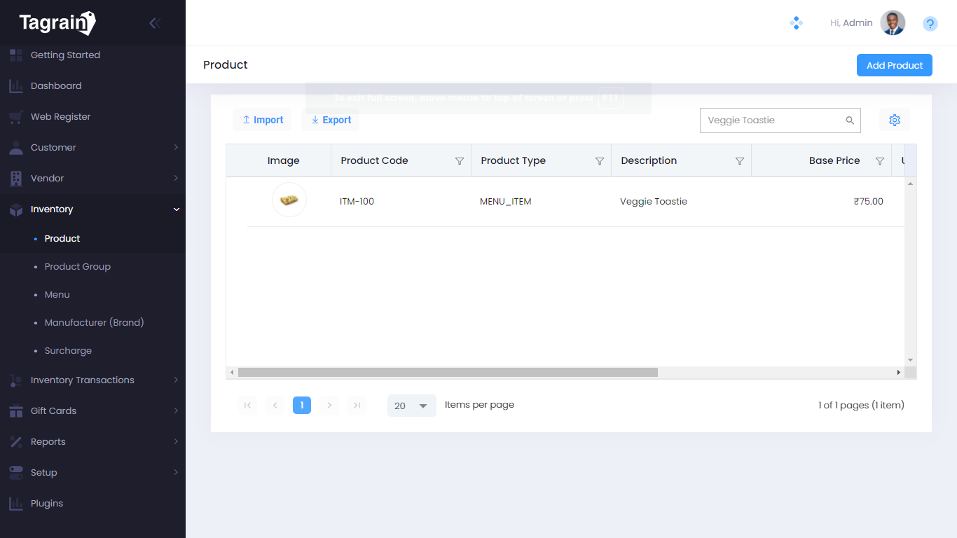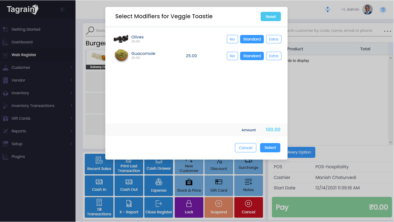 Tagrain hospitality, though available as a plugin, is more of an industry vertical. This vertical is targeted towards small cafes and restaurants who are selling food items like Burgers, Wraps, Sandwiches, Muffins, Pastries and beverages like coffee, tea and bottled drinks.