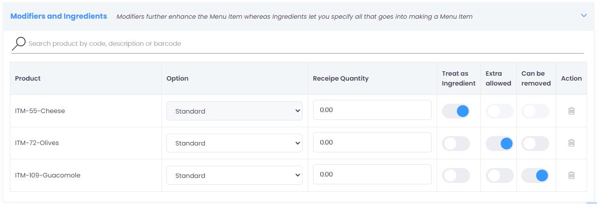 The Extra Button enabled against an item signifies that it will be added as an Extra portion / quantity as defined under the Recipe Quantity header under the Modifiers and Ingredients accordion. As shown in the image above, Olives has Extra enabled against it. This means that if the Veg Toastie is selected with Olives set to Extra, an extra quantity of Olives, will be added as a modifier by default.