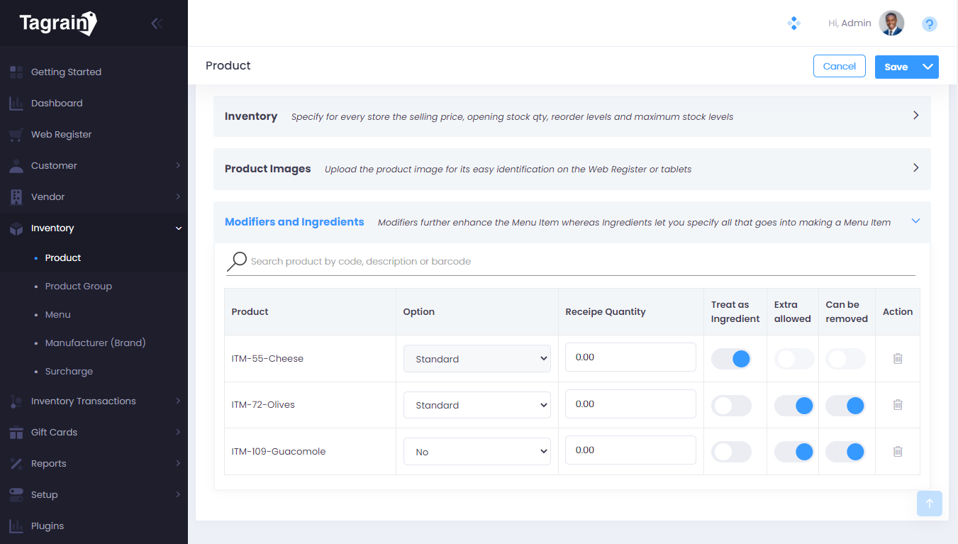 As stated earlier in this article, a Modifier can be treated as an Ingredient in Tagrain Hospitality. This is generally done for better inventory management and reporting. In this section, we will see how you can mark a Modifier as an Ingredient.