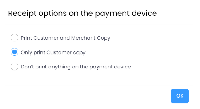 Selecting the No Receipt option on the Moneris Payment Device will display the following pop up screen on the POS terminal.