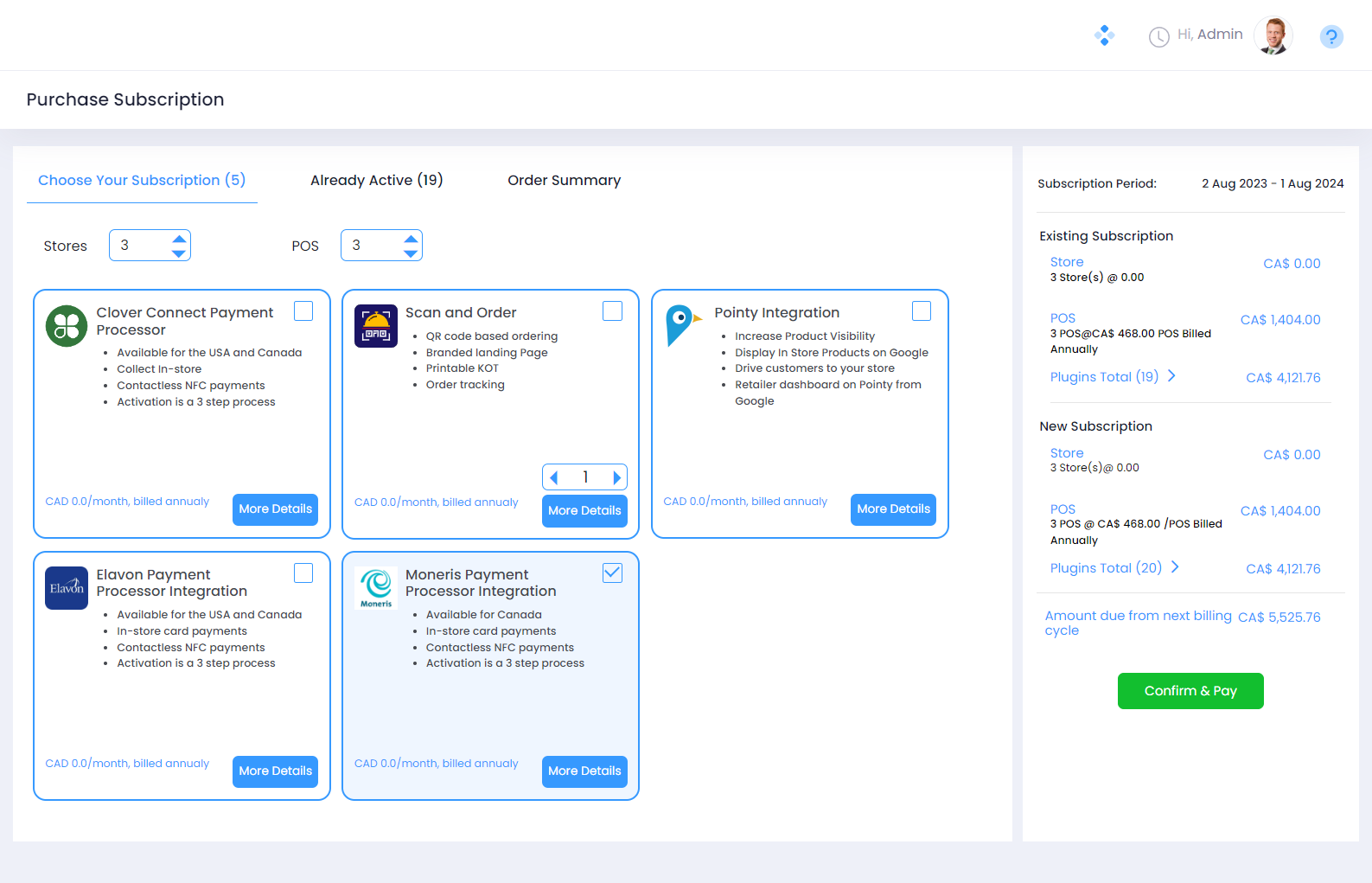 Step 3. Navigate to the Choose Your Subscription section on the Purchase Subscription page. You should see the Moneris Payment Processor plugin unselected. You simply need to put a tick against the activation check box on the Moneris Payment Processor plugin Tile to mark the plugin as Active.