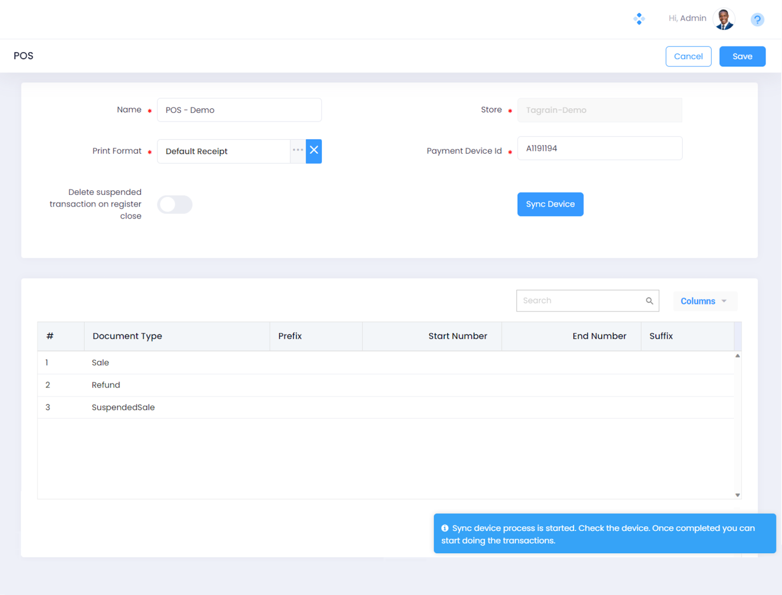 Step 4. Click the Sync Device button below the Payment Device ID field. Upon successful sync, you should see a notification banner at the bottom right corner of the screen.