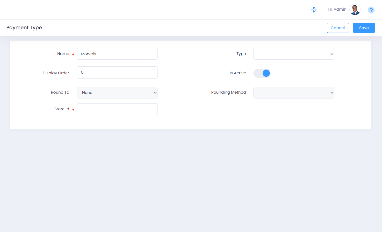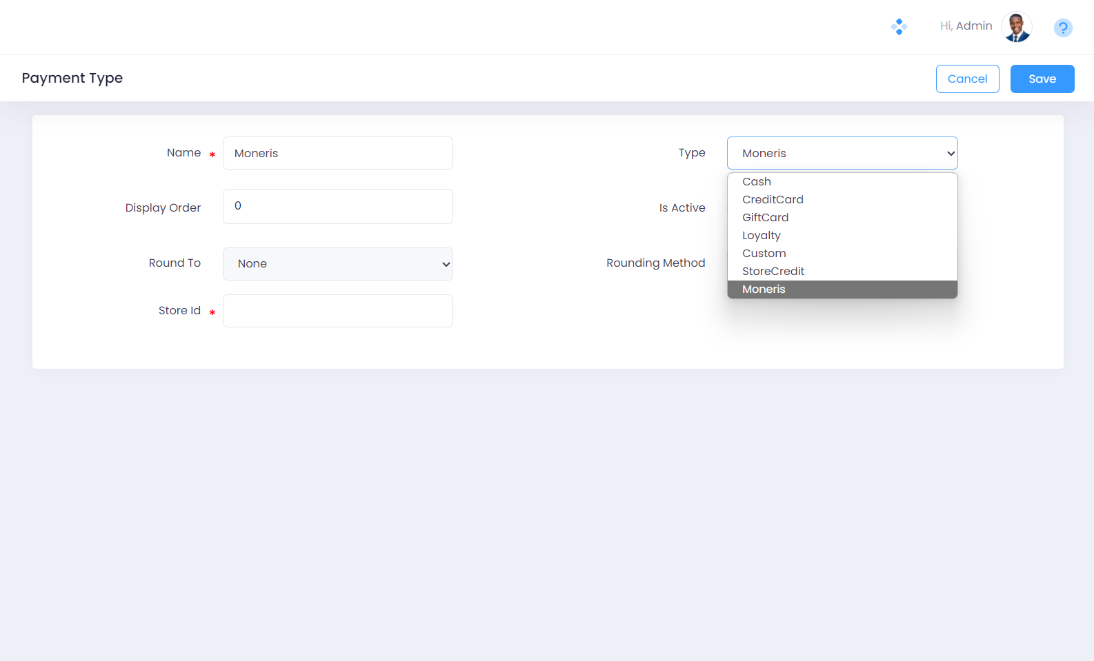 Step 3. Specify the name for the Payment Type. In this illustration, we have specified “Moneris” as the payment type name.