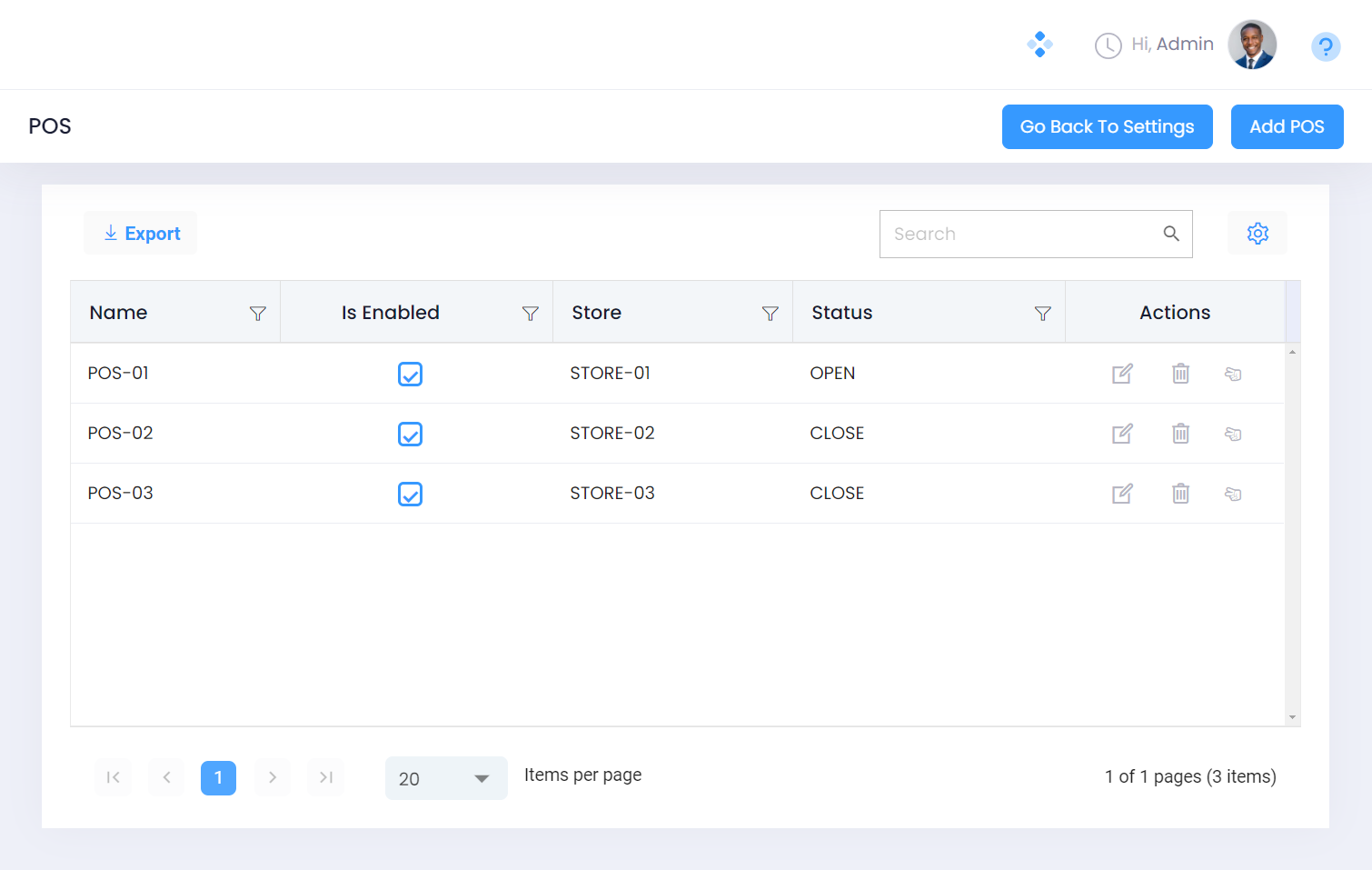Step 2. Click on the POS button to open the POS List View Screen. This screen displays a list of POS already defined in the application.