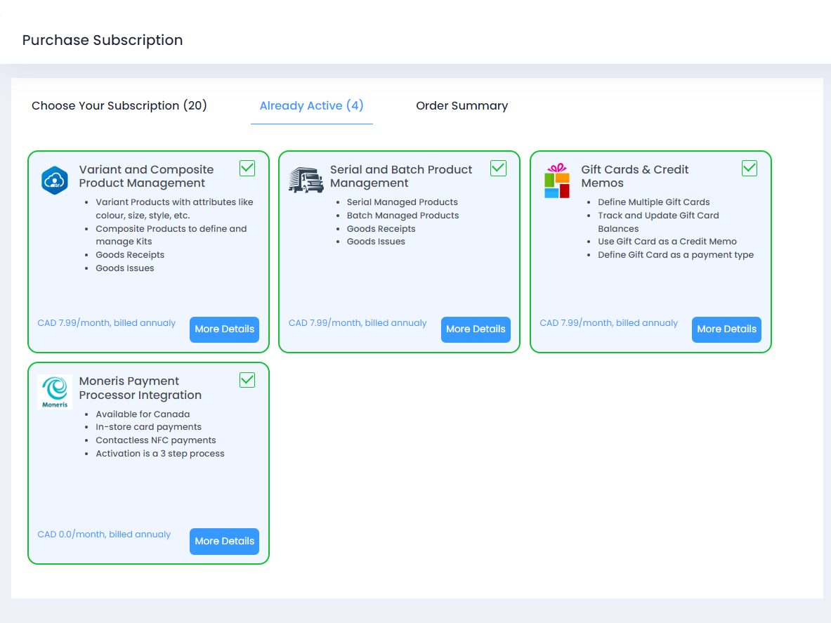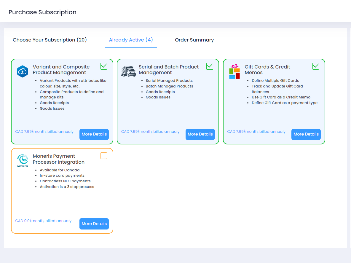 Step 4. Navigate to the Already Active section on the Purchase Subscription page. You should see the Moneris Payment Processor plugin unticked / deselected for deactivation.