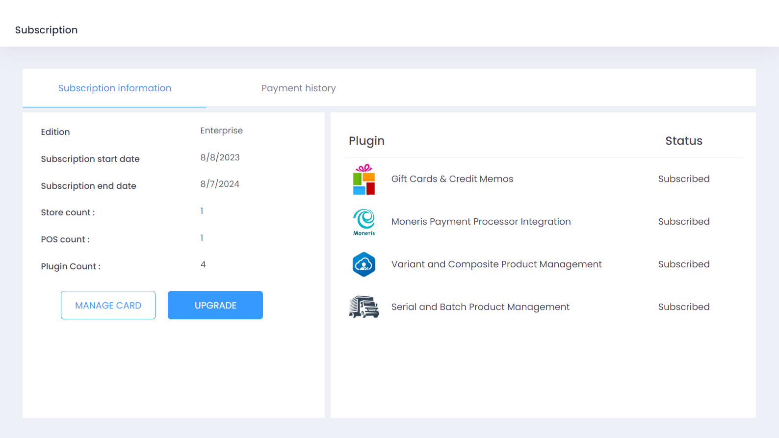 Step 3. Navigate to the Already Active section on the Purchase Subscription page. You should see the Moneris Payment Processor Integration plugin. Untick / deselect the plugin to mark the plugin as Inactive.