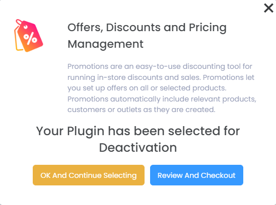 Step 2. Click the “Deactivate” button on the Offers, Discounts and Pricing Management Plugin Tile. You can click “More Details” to read about what this Plugin offers including screenshots and an FAQ section. In case you change your mind, you can click on the “Unselect” button to cancel deactivation.
