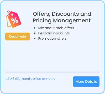 Deactivating the Offers, Discounts and Pricing Management plugin will have an impact on your existing subscription. Click here to know more about Subscription Management in Tagrain which details the plugin activation journey.