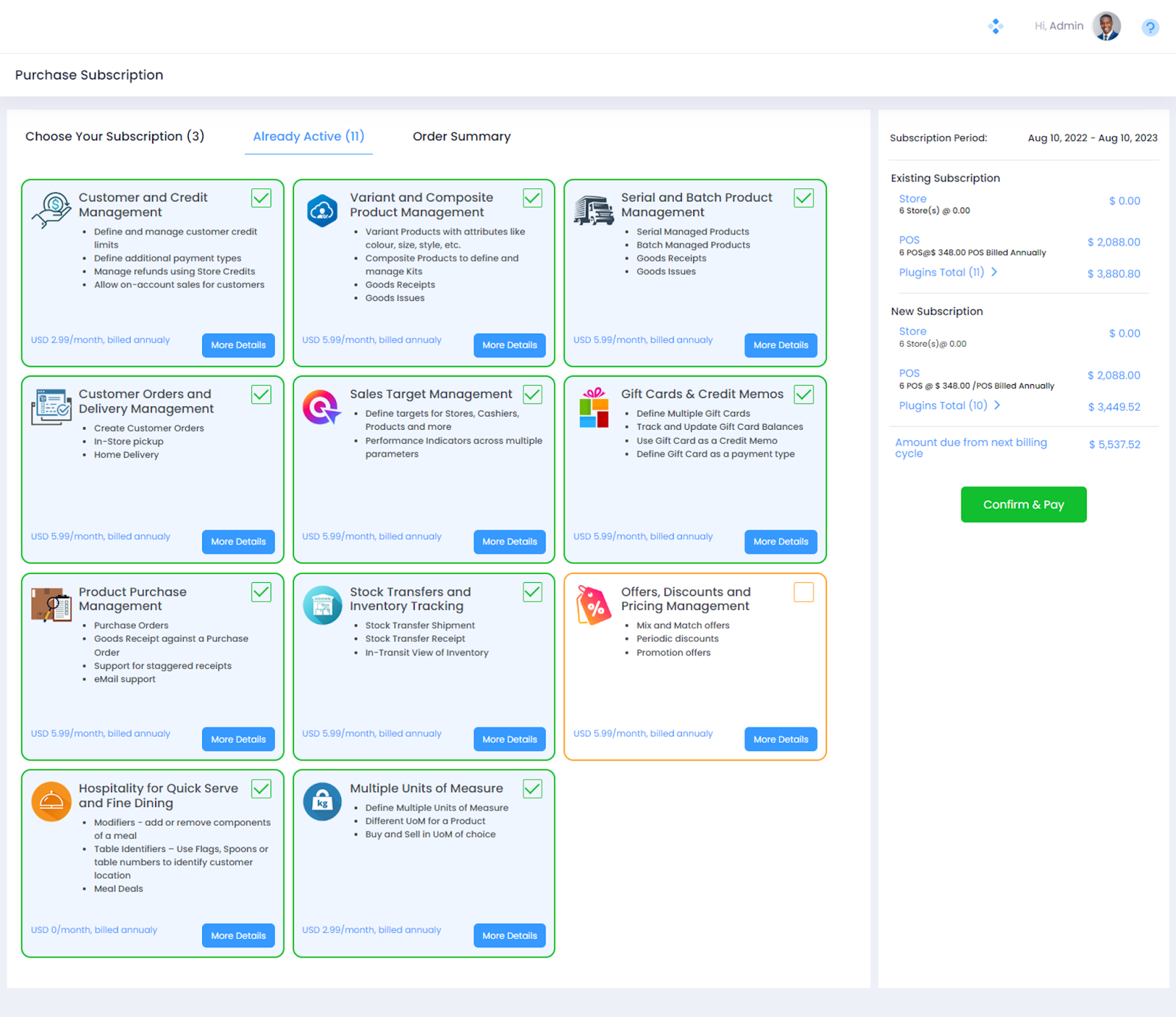 You can navigate to the Plugins Screen and click on the Activate button on the Offers, Discounts and Pricing Management Plugin Tile. In the notification pop up that opens click on the Review and Checkout button to reach the Purchase Subscription Screen.