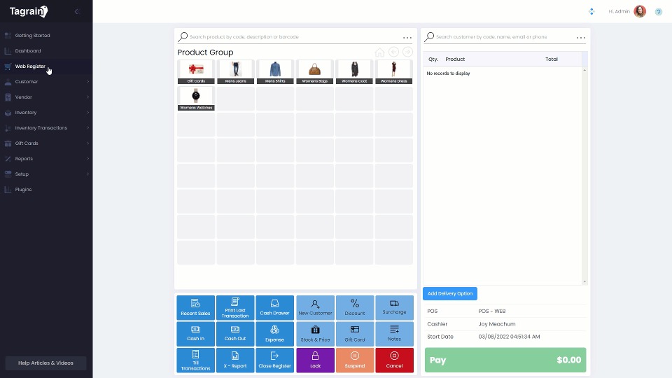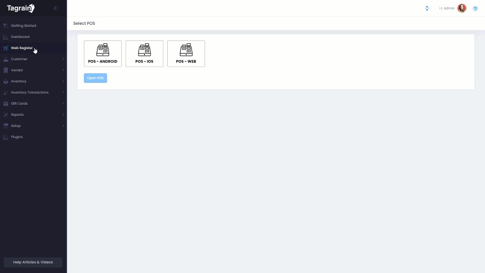 Step 1. Log in to the Tagrain Web POS. Click the “Web Register” in the left menu bar. The POS selection screen will come up. Select the “POS” you wish to open and click the “Open POS” button.