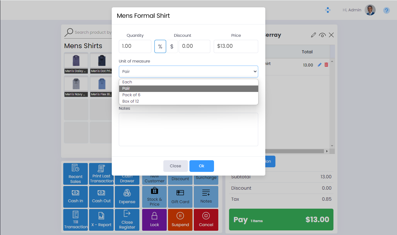 After all the items have been added to the transaction list with appropriate discounts, surcharges, and notes, click on Pay to proceed to the Payment screen.