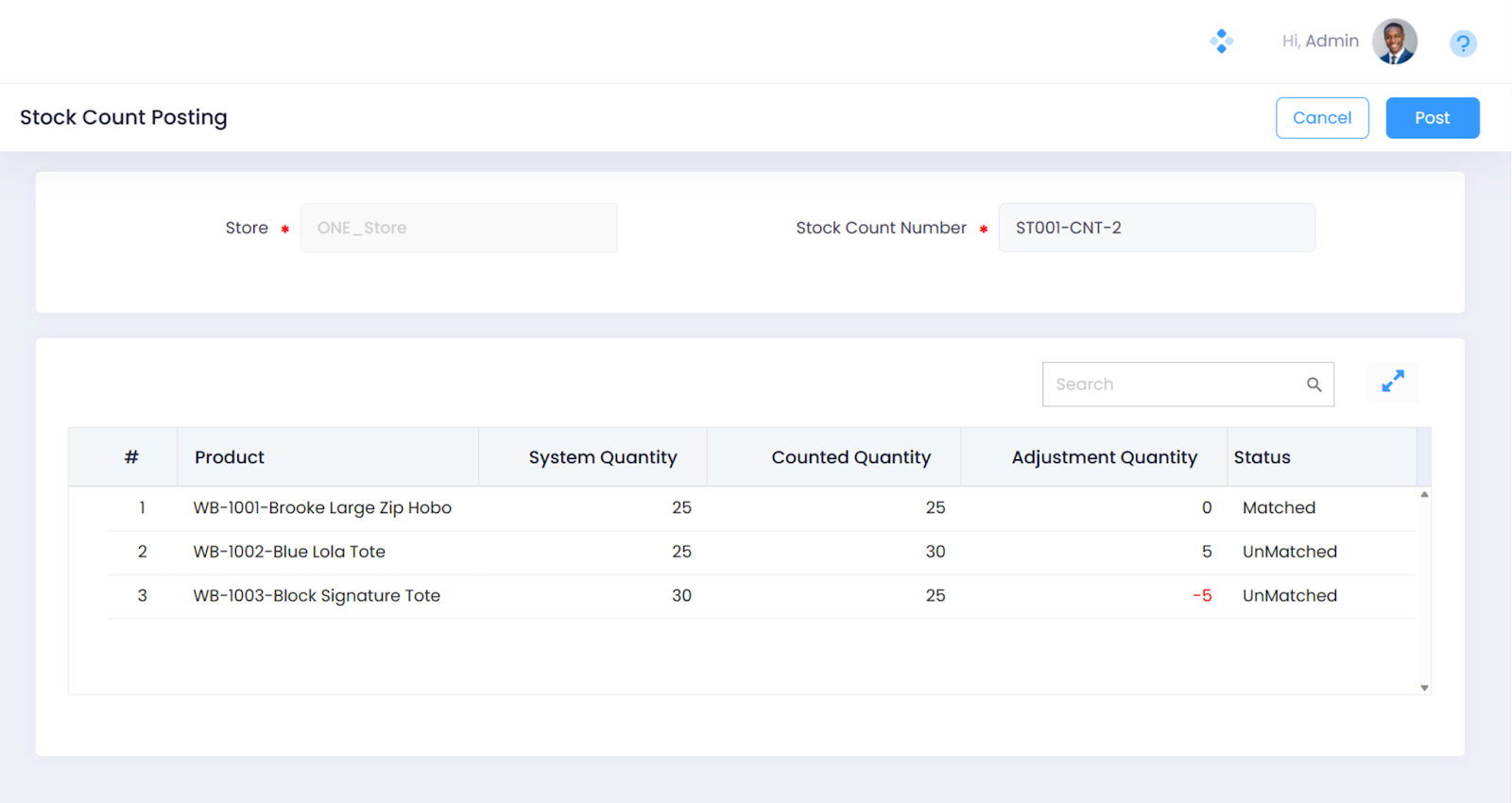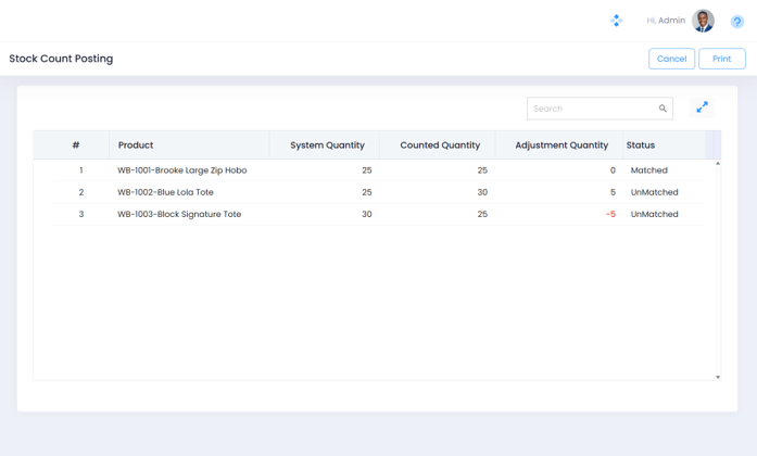If the counted quantity is the same as system quantity, the status will change to Matched and in case the counted quantity is different from the system quantity, the status will change to Unmatched.