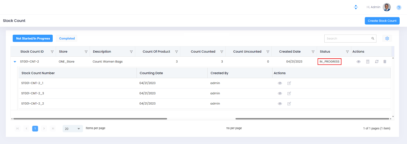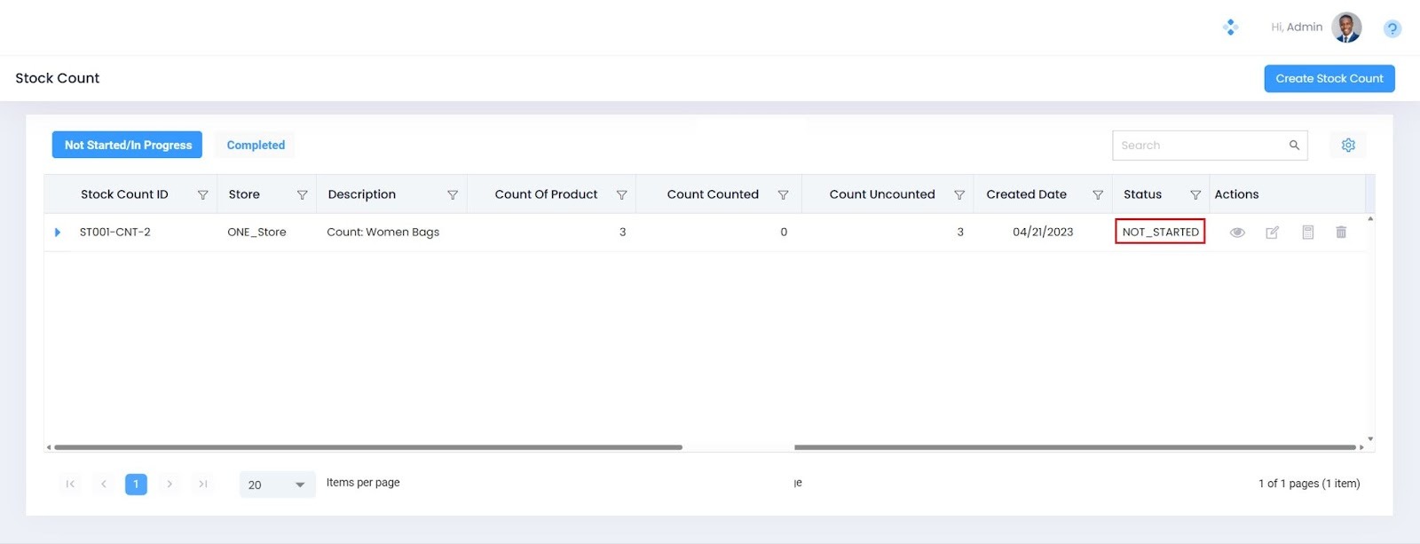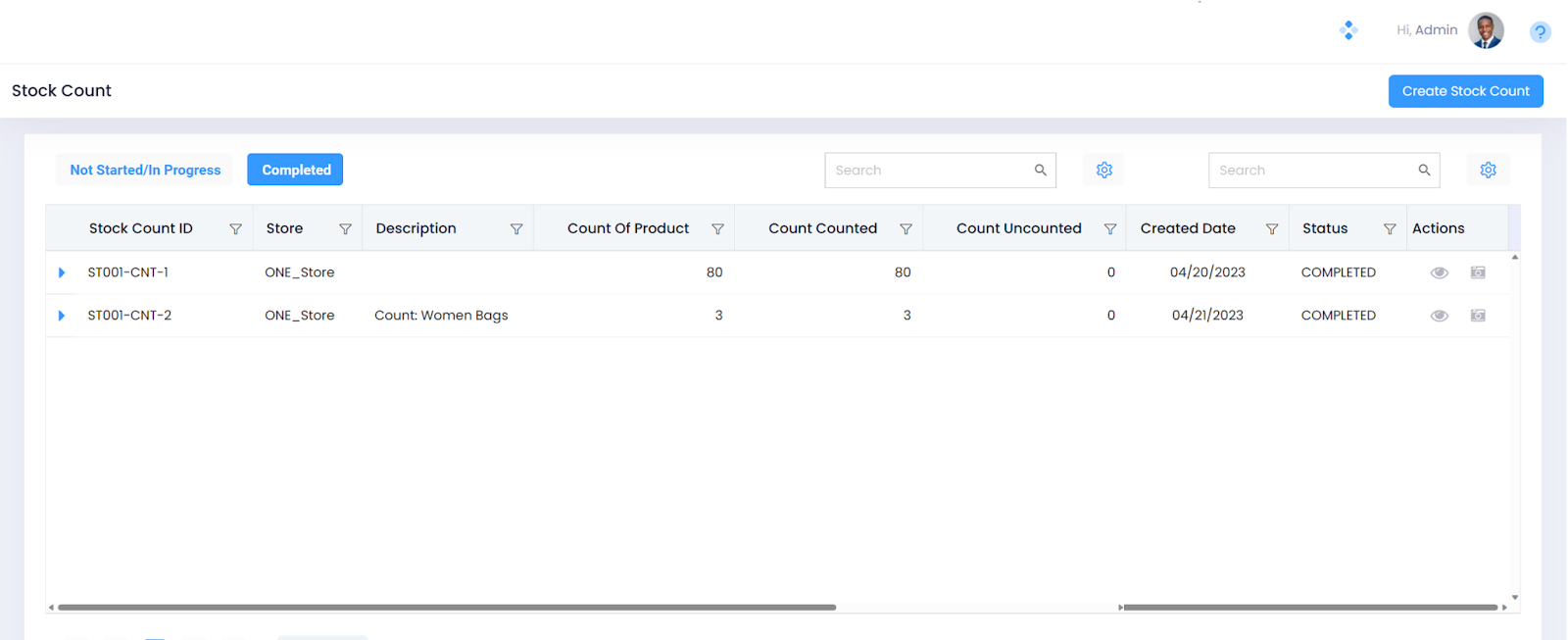 Step 1. Navigate to Home > Inventory > Stock Count to open the Stock Count List View Screen. All the Stock Counts - In Progress and Completed are listed on this screen.