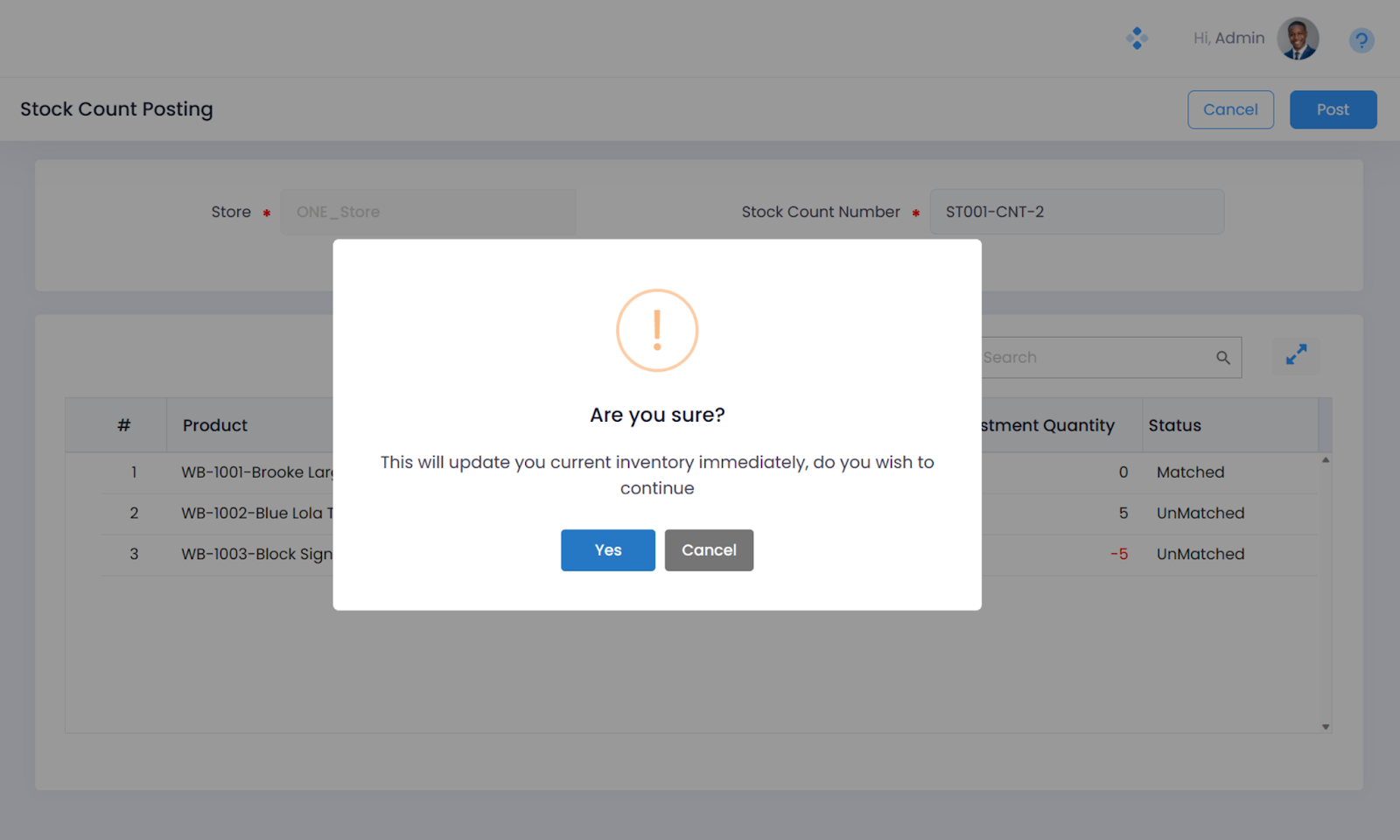Step 10. Click on the Post button. You will see a notification pop up asking you to confirm if you would like to update the current inventory. (As shown in the Screenshot below)