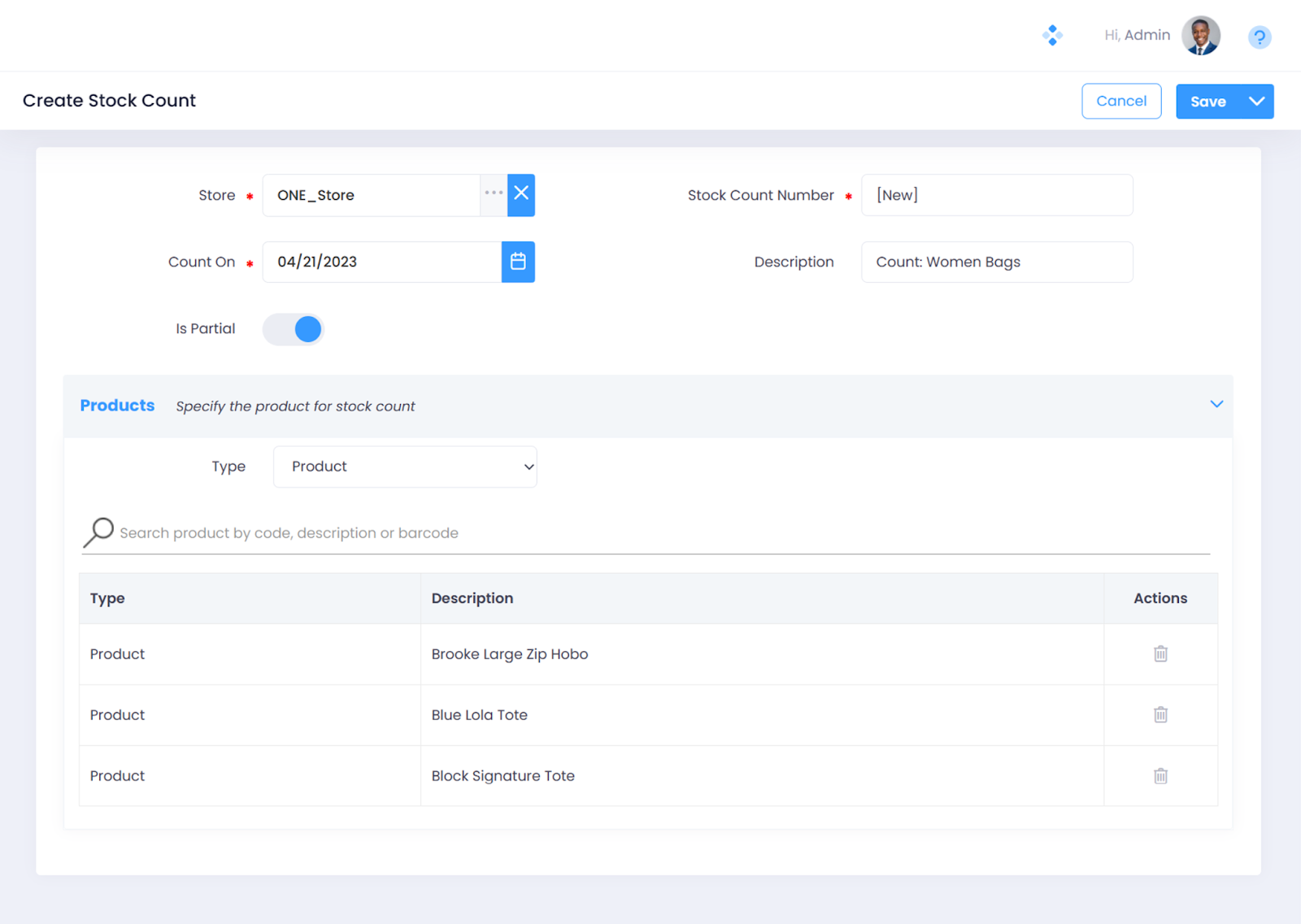 Step 6. Flip the Is Partial switch ON to display the Products accordion. Flipping the Is Partial switch ON will display an additional accordion called Products. This accordion allows you to perform stock counting for a specific product, product group, or product tag.