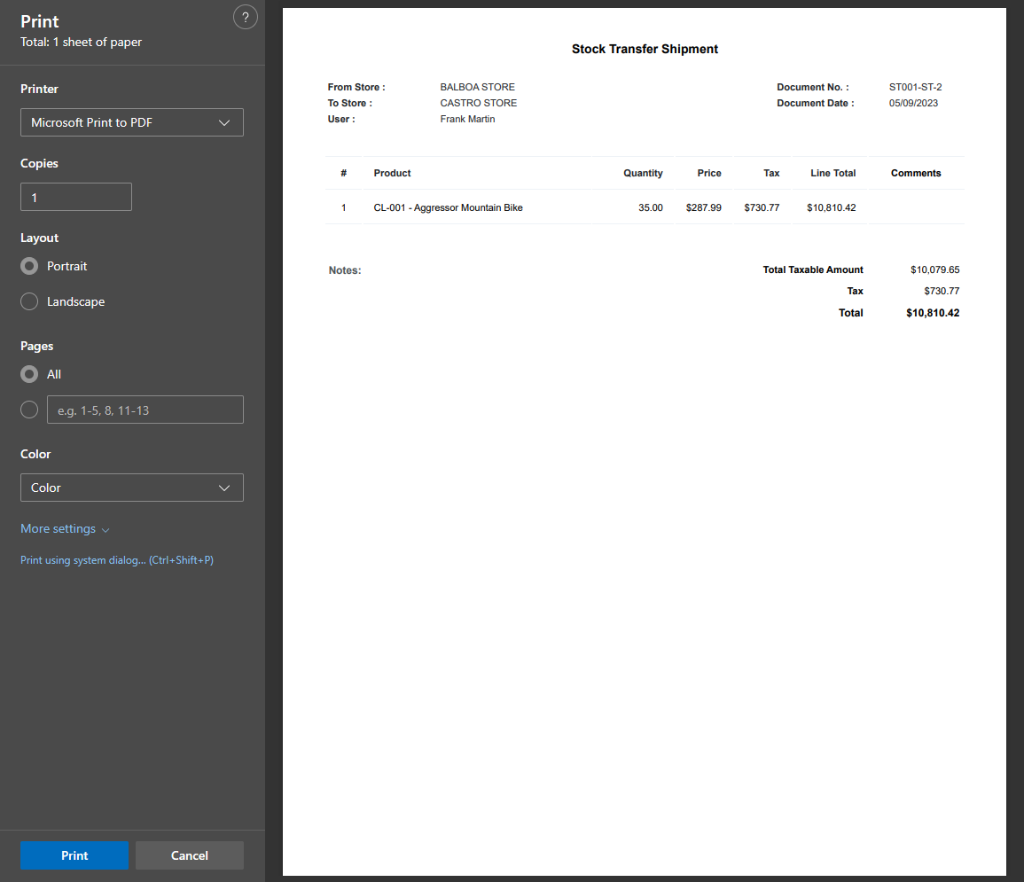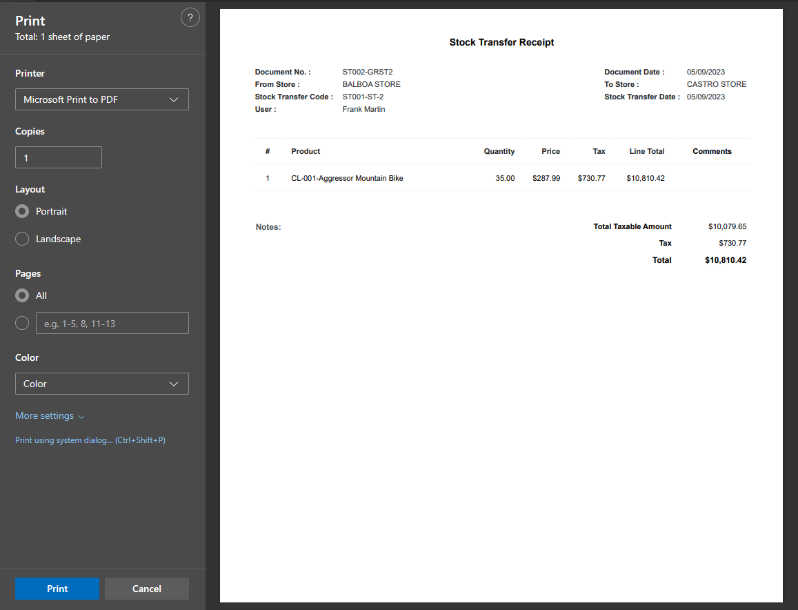 Step 11. Click the Save button. This will open the Stock Transfer Shipment Receipt Document. You can choose to print this document using the Print button.