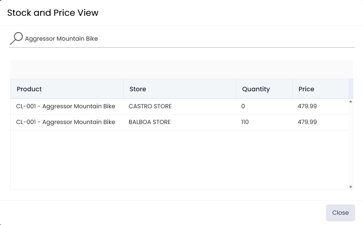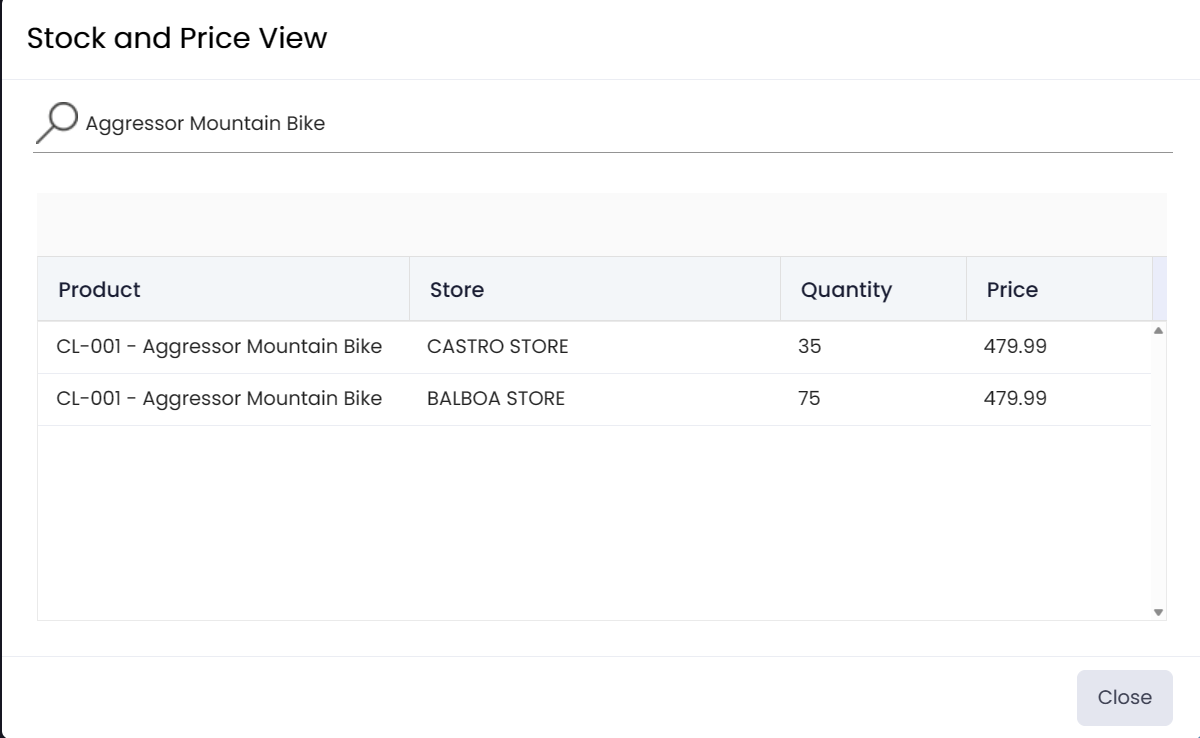 We had 110 quantities of the Aggressor Mountain Bike product at the BALBOA Store. However, the CASTRO Store had none. So using the Tagrain Handled device we transferred and received 25 quantities more, which makes it 50 quantities.
