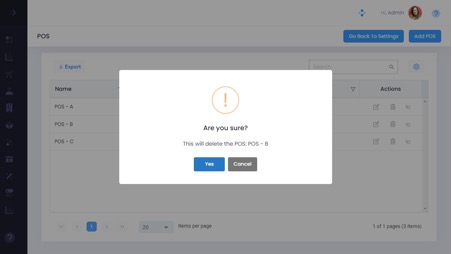Click on the Delete button next to the POS Register that you want to delete. You should see a confirmation dialog box asking you to confirm the deletion. Click Yes to confirm deletion. Click Cancel to return to the POS List View Screen.