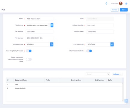 Click the edit symbol next to the POS Register that you want to edit. This will bring up the Update POS Screen, wherein you can edit POS Register Name, update Print Format etc.
