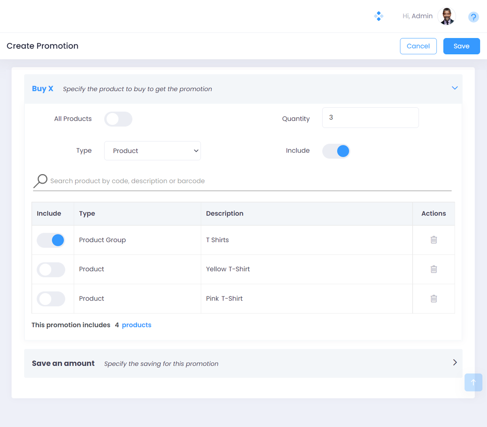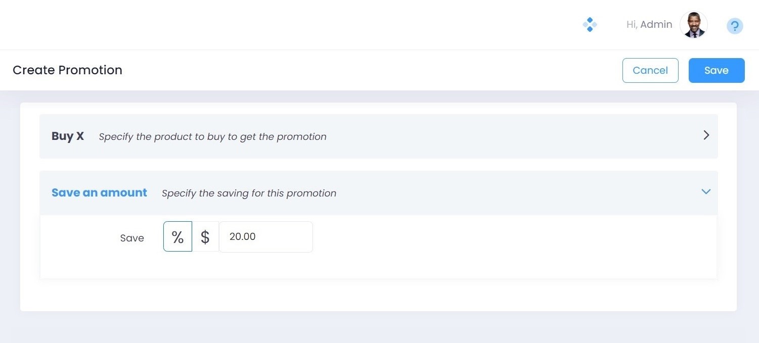 Select Buy X | Save an amount as your promotion in the Promotion Type drop-down.