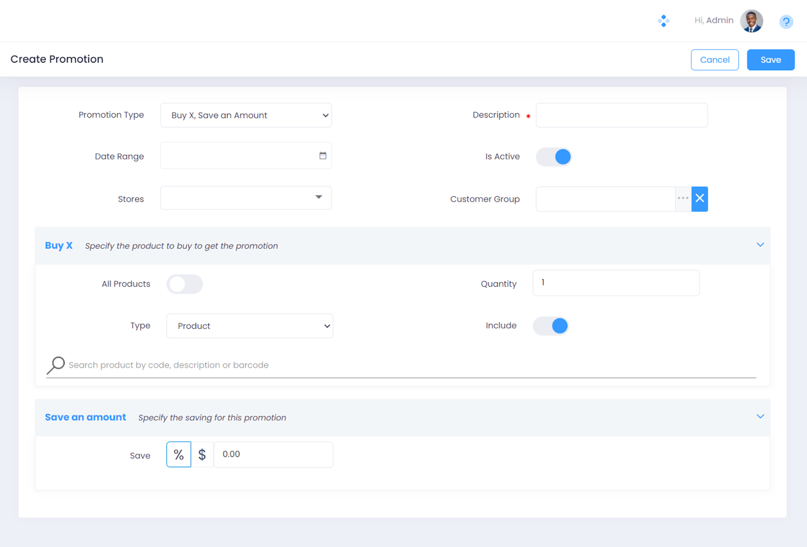 To define Buy X | Save an amount Promotion, you need to fill in the Promotion Header followed by the Buy X and Get Y accordions. The mandatory fields are marked with an (*) asterisk mark. For a detailed explanation on each accordion and its fields, please refer to the Screen Based Guide on Promotions