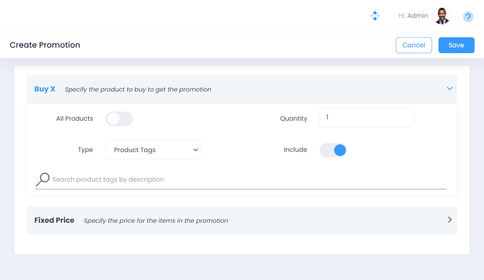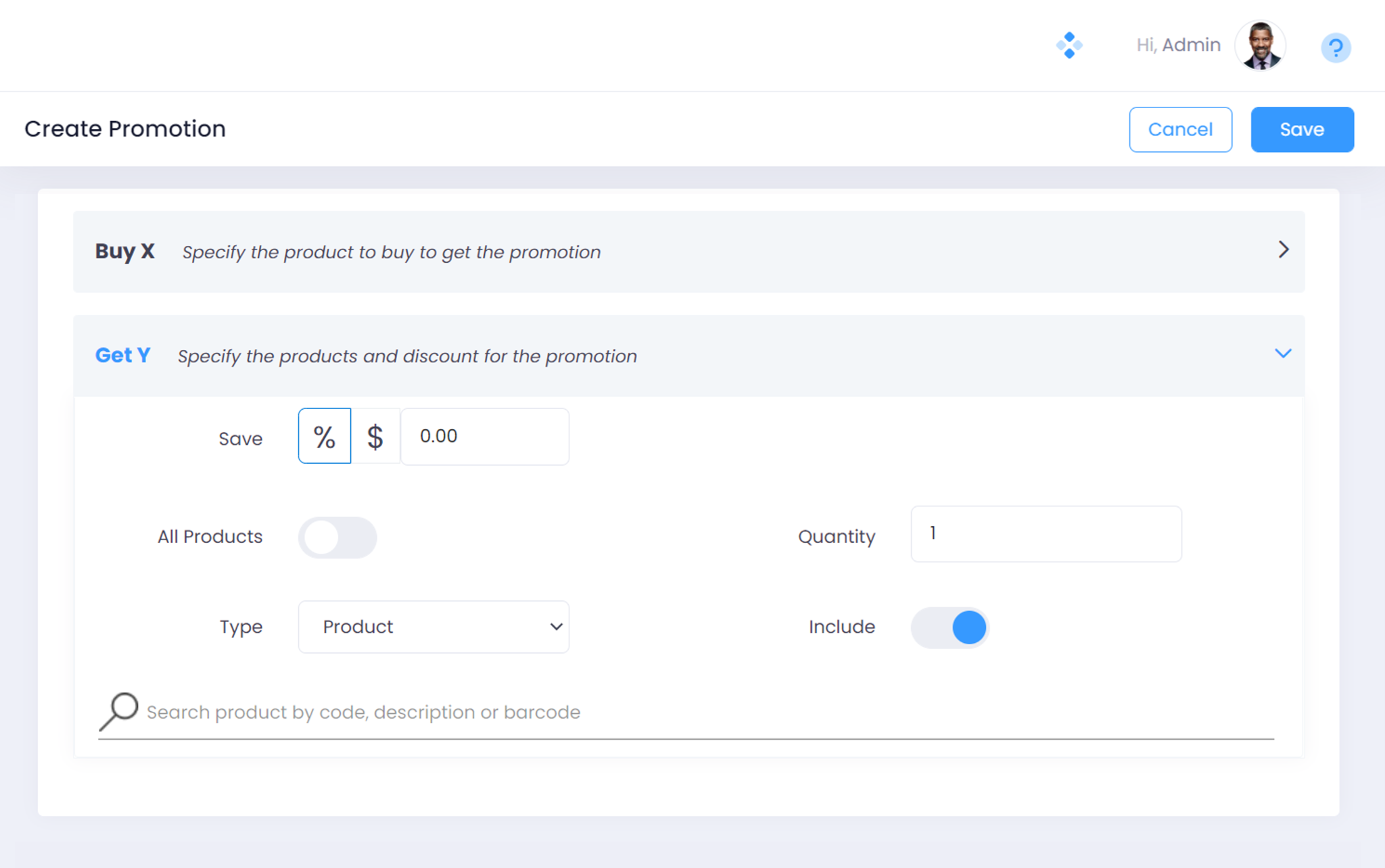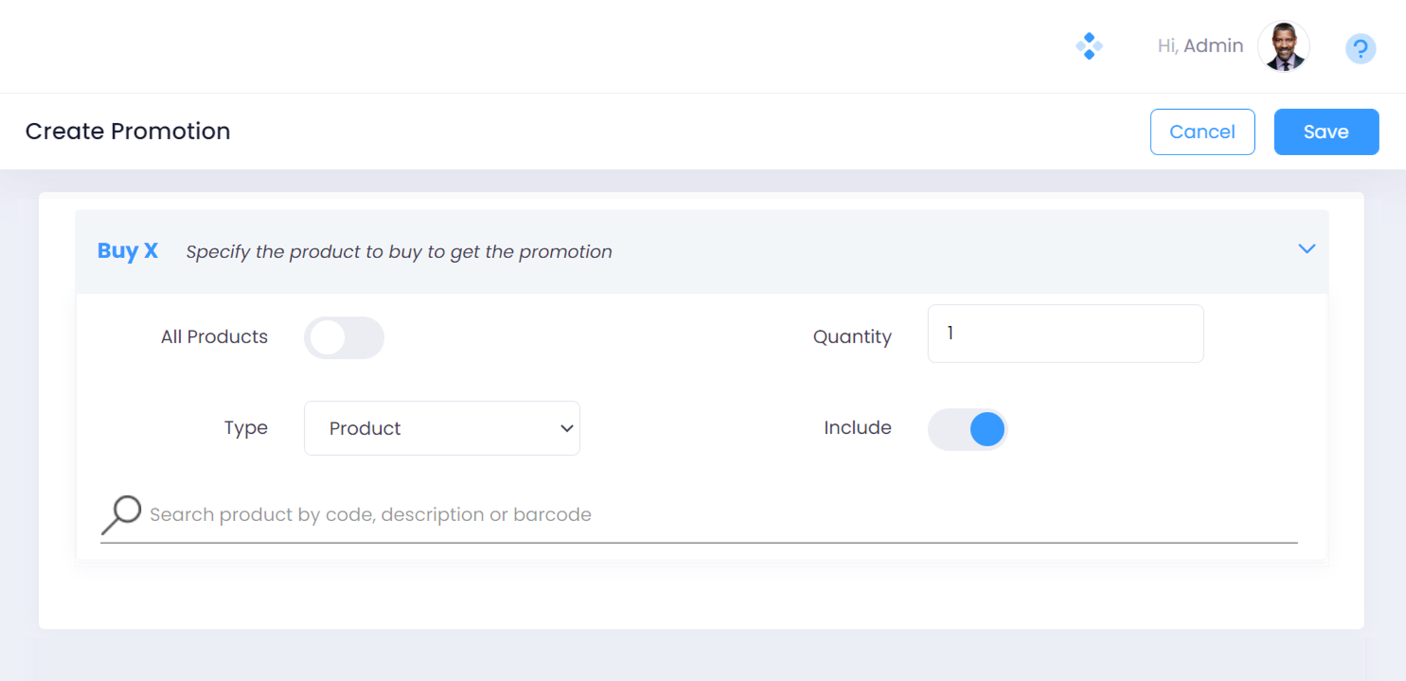 This field allows you to search and select the product(s), the product group(s), the manufacturer(s) or the product tag(s) where this promotion would be applicable. You can also search a product using its code, description, or barcode. You can search a product group, manufacturer, product tag using its description.