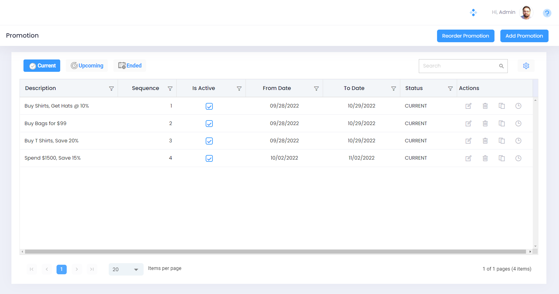 The Promotion List View Screen has 3 sections – Current | Upcoming | Ended. These sections help you bifurcate the Promotions.