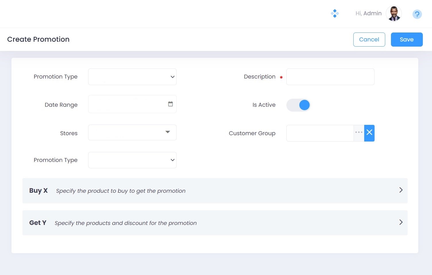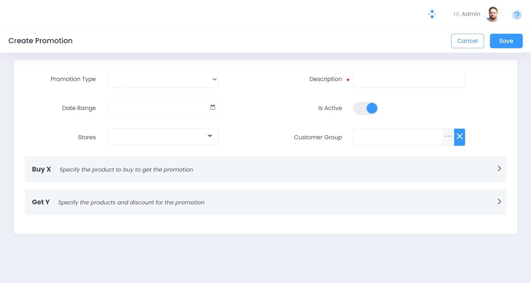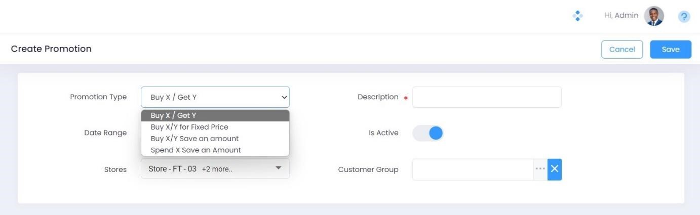 The Header, for each of the 4 promotion types, remains constant. You are required to select a Promotion Type, specify its description, pick a date range this promotion would last for, the Store(s) where this promotion would be offered, along with the customer group on which this promotion would be applicable. Not all the fields in the Header accordion are mandatory. For Example, you can choose not to define a customer group.
