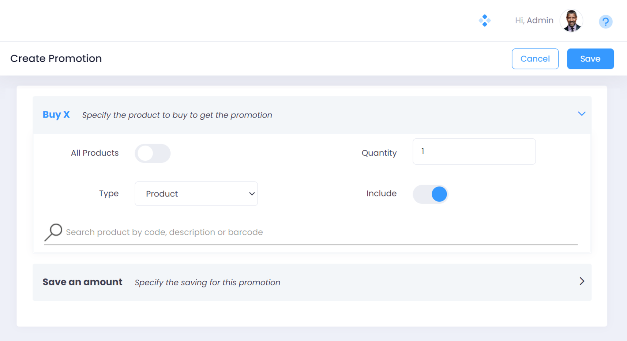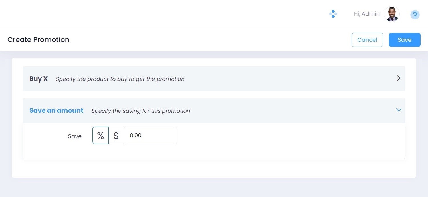 This accordion allows you to specify a % or an amount that your customer would save if this promotion was applied. This amount reflects in the transaction total. For Example, in the case of Buy 3 Women’s Bag and Save 15% you need to specify 15% in the Save field.