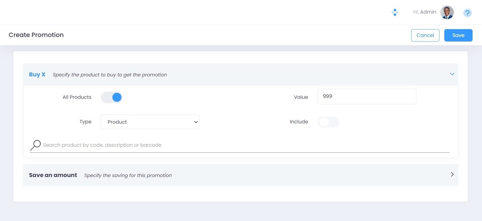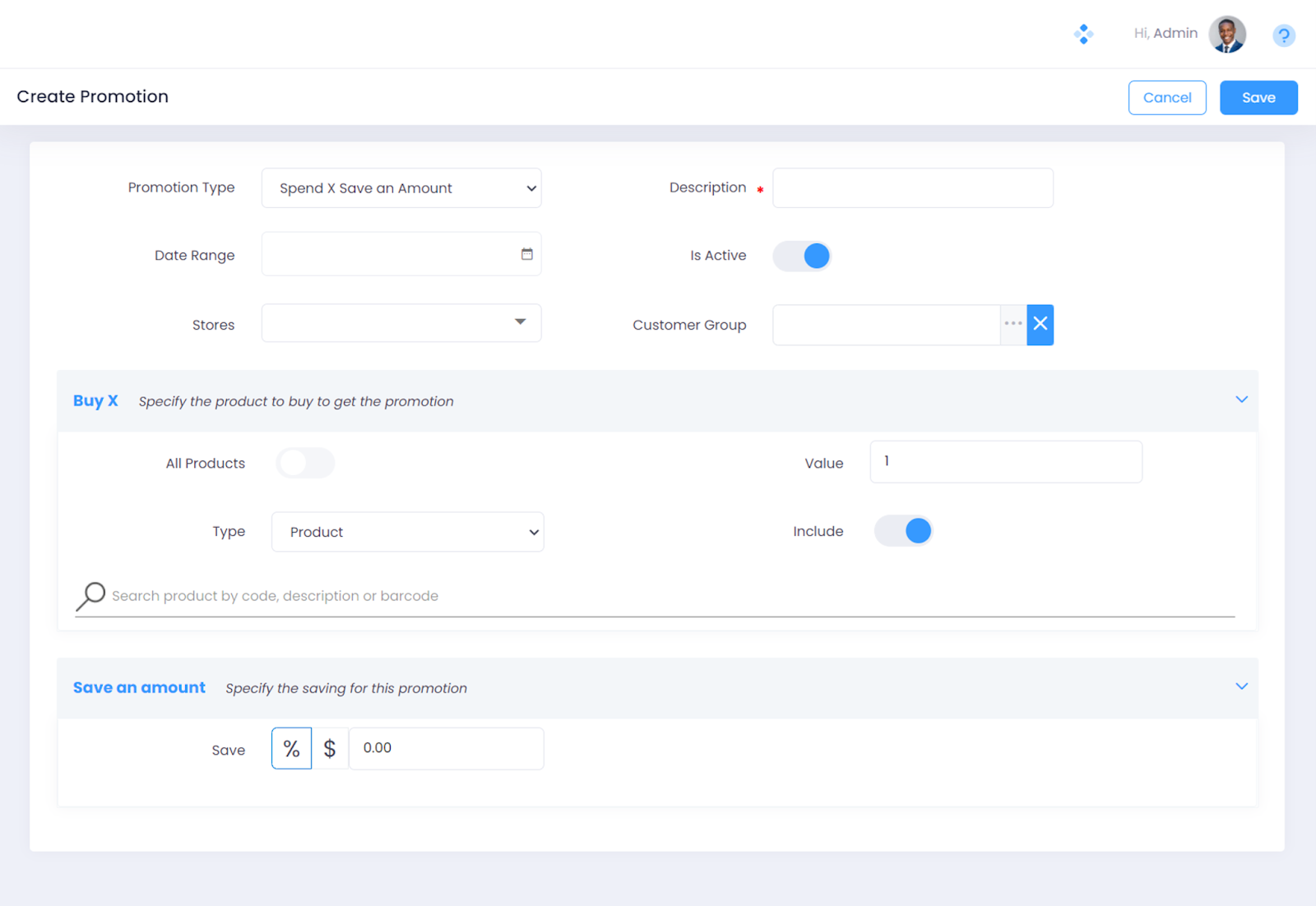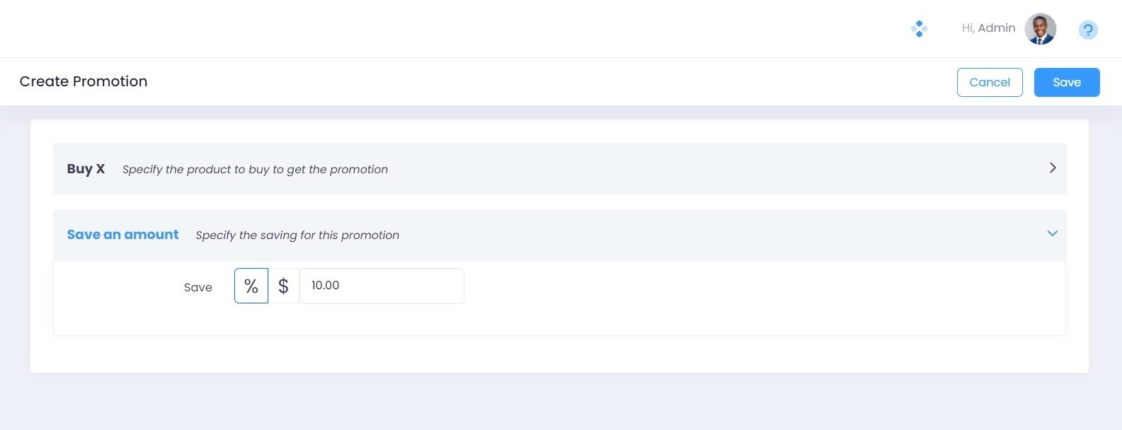 Select Spend X | Save an amount as your promotion in the Promotion Type drop-down.