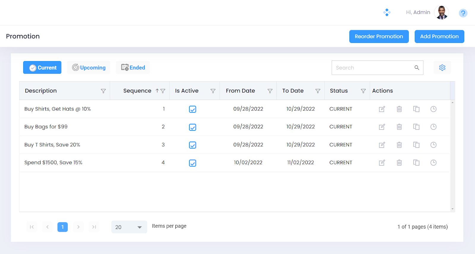 Navigate to Home > Inventory > Promotion to open the Promotion List View Screen. All the existing Promotions are listed here on this screen. This screen is divided into sections - Current | Upcoming | Ended. Each section displays a list of promotions which can either be the current promotions or the upcoming promotions or the promotions that have ended, depending upon what section is selected. See: Promotion Screen Based Guide
