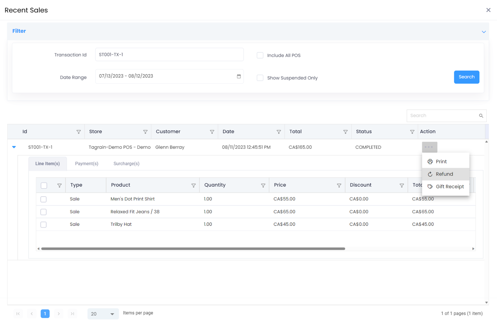 Select the transaction that needs to be refunded from the Recent Sales screen and then click the Refund button to open the Refund Transaction screen.