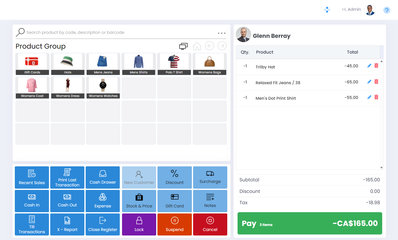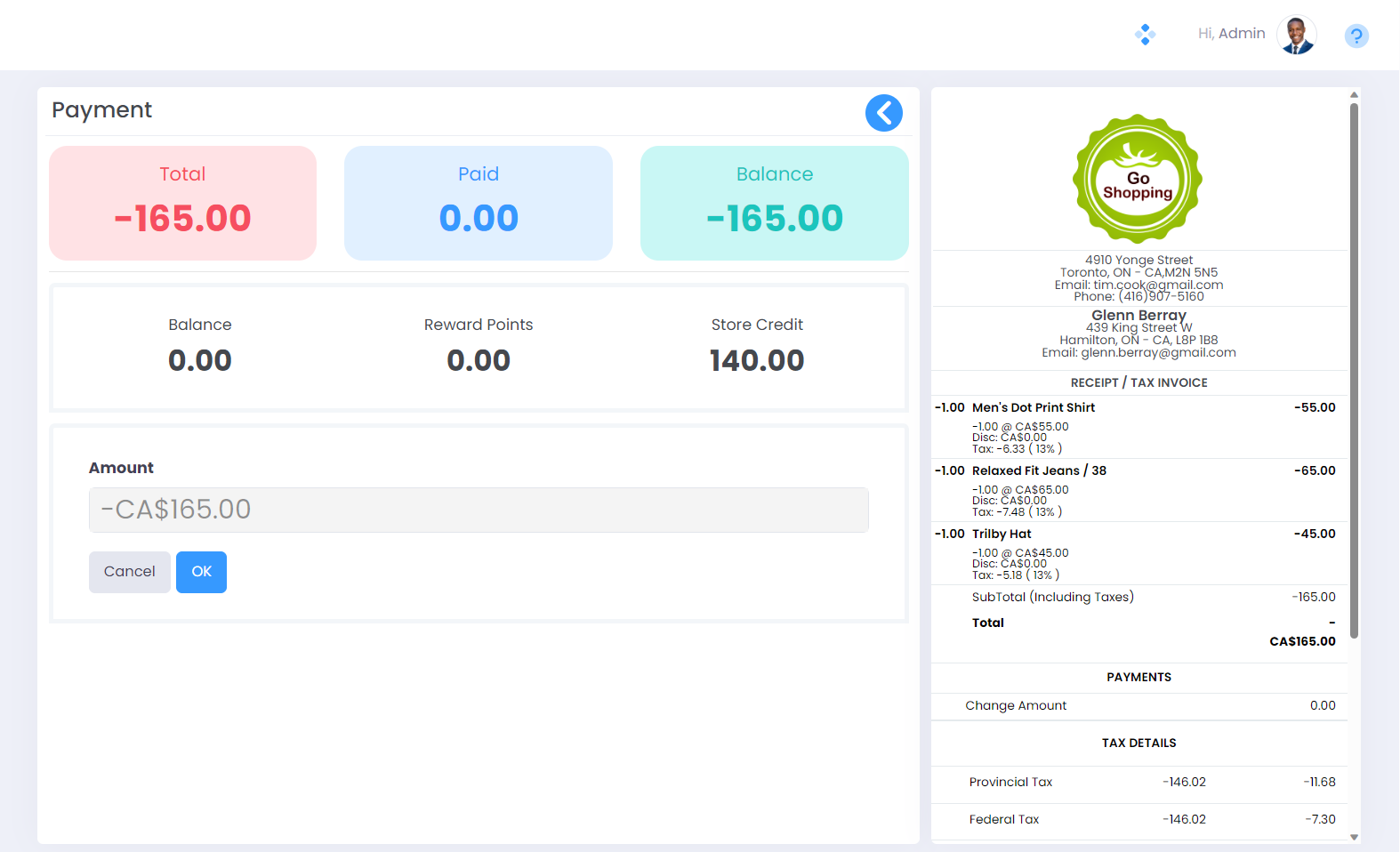Click the Moneris button, to refund the Credit/Debit card payment using Moneris. The Amount To Pay field will be populated with -$165. This amount of $165 was collected using the Moneris Payment Device in the original sale transaction.