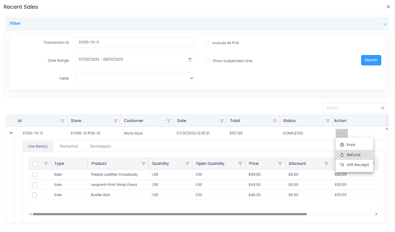 Select the transaction that needs to be refunded from the Recent Sales screen and click the Refund button to open the Refund Transaction screen.