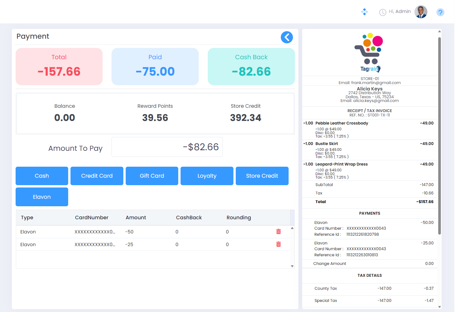 Elavon Payment Processor plugin is a software module that seamlessly integrates with Tagrain POS and allows you to offer a quick, seamless and secure payment experience to your customers. Once set up, cashiers can take credit and debit card payments from customers at the POS using the Elavon Payment Device. This integration helps your cashier by removing the need to manually enter the amount and card details at the POS.