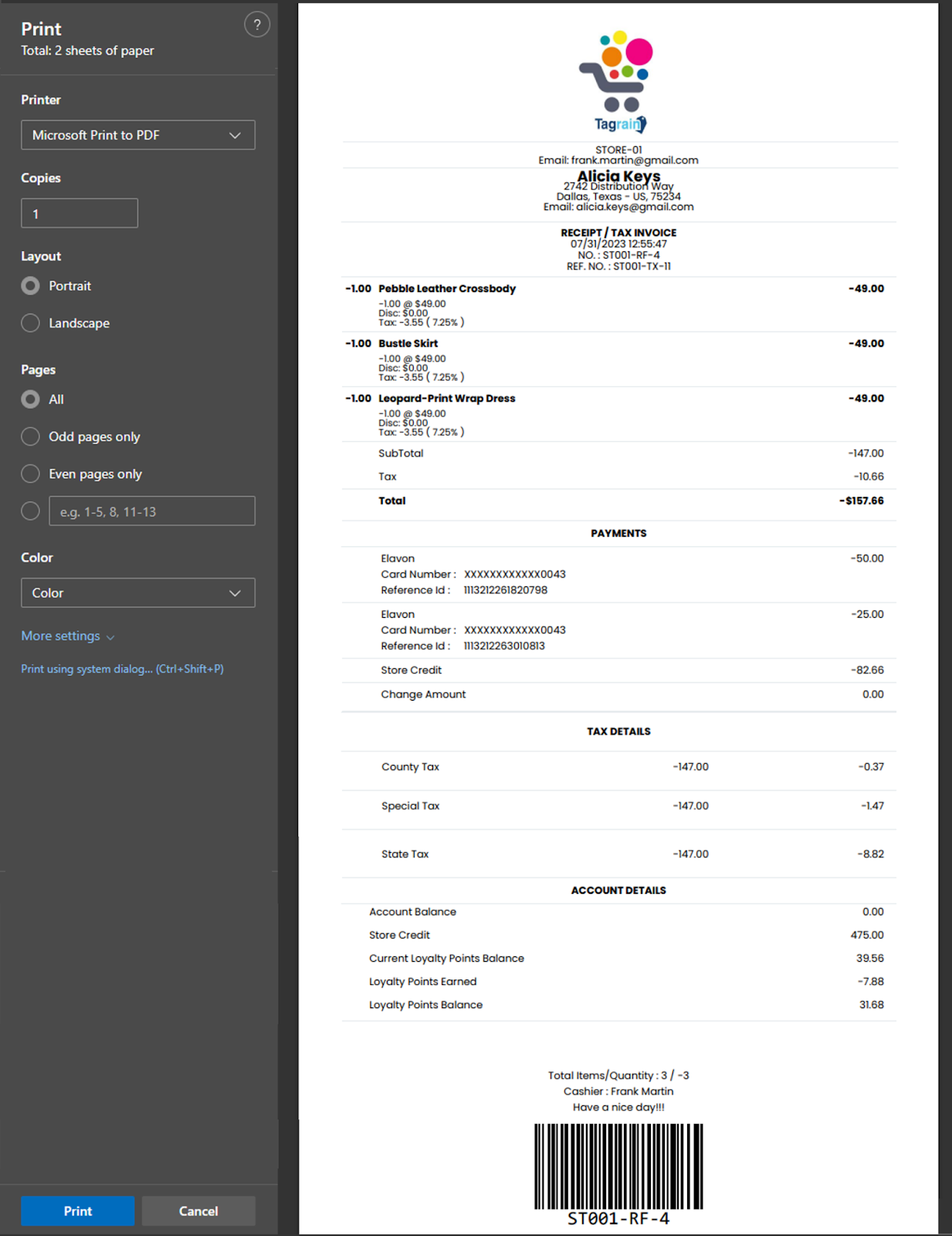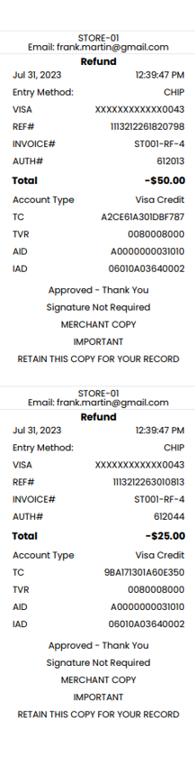 In the scenario that we just mentioned, where the refund has been made using 2 different credit cards, the application will print the following receipts: