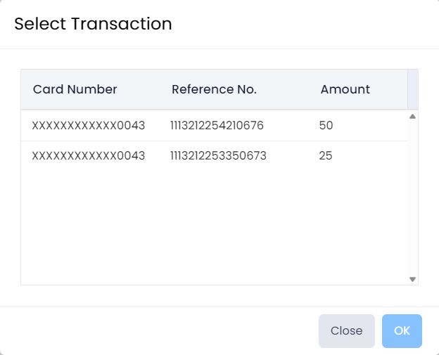 Select a card and then click OK to process the refund. The acknowledgement is sent to the Elavon Payment Device.