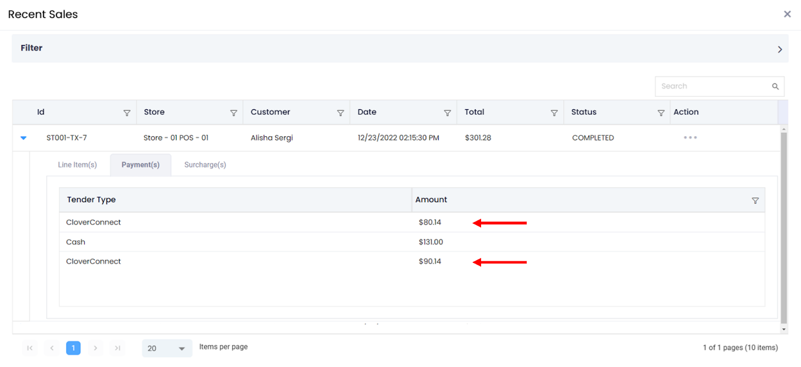 You will notice that Clover Connect is listed as a Tender Type and this entry appears twice. This is because the customer has paid using 2 different credit cards. He has paid $90.14 using one card and $80.14 using another. So for Clover Connect these are 2 separate transactions.