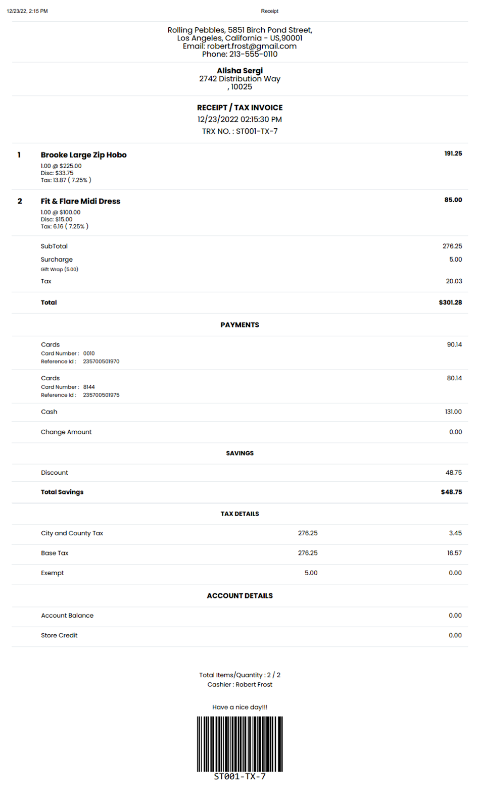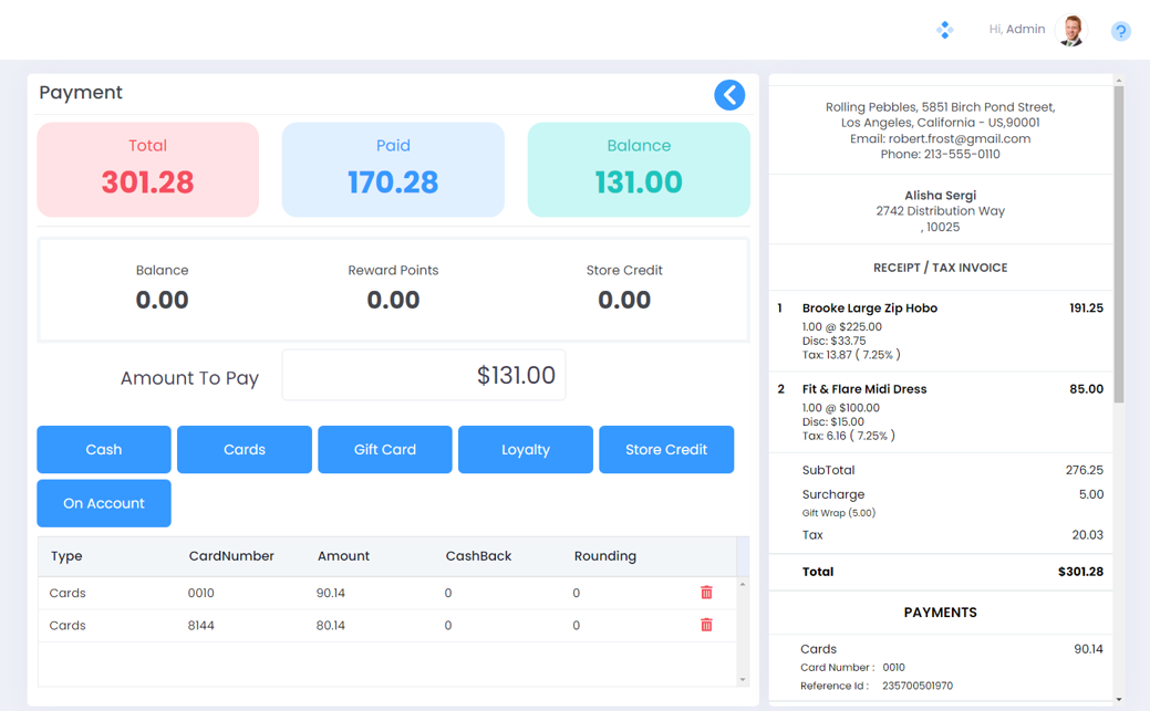 Let’s assume that the customer pays $90.14 using one card and $80.14 using another. The balance $131 is paid in cash.
