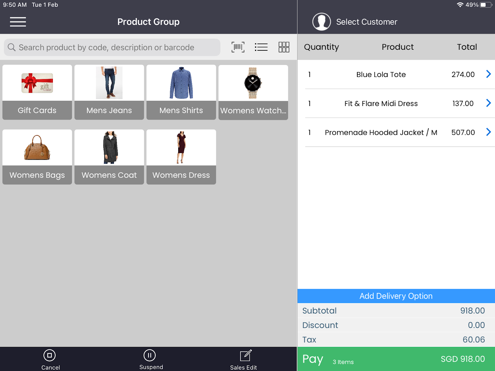 To add the products searched above, you need to tap on that product. This will add the product on the transaction screen.