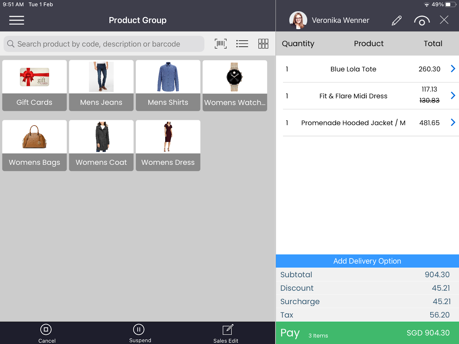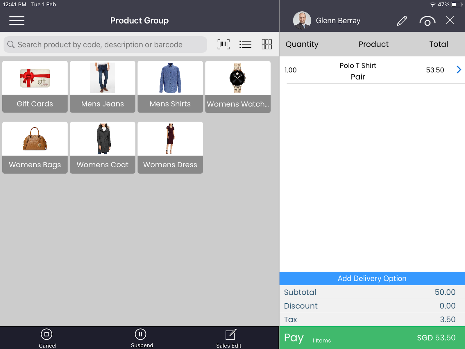 There are multiple ways to search a product that you want to sell in Tagrain using the Tagrain App for iPad. You can search for the product that the customer has ordered by using either the search bar, or by selecting the product itself via the product group tile, or by using your barcode scanner to scan in the product barcode.